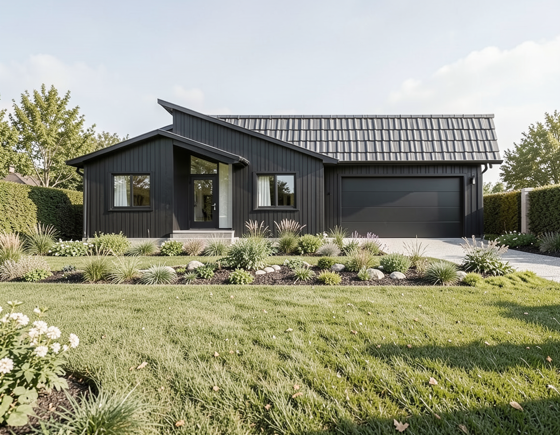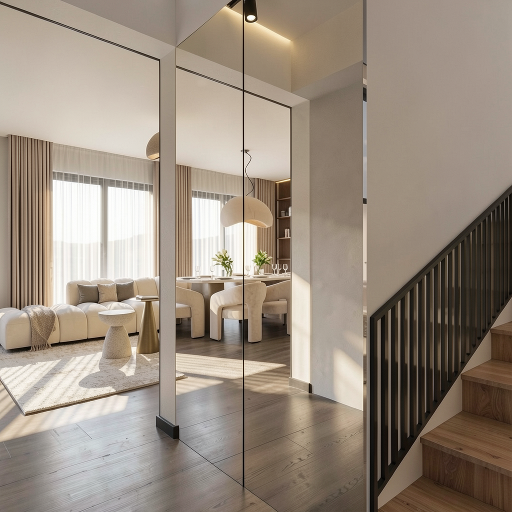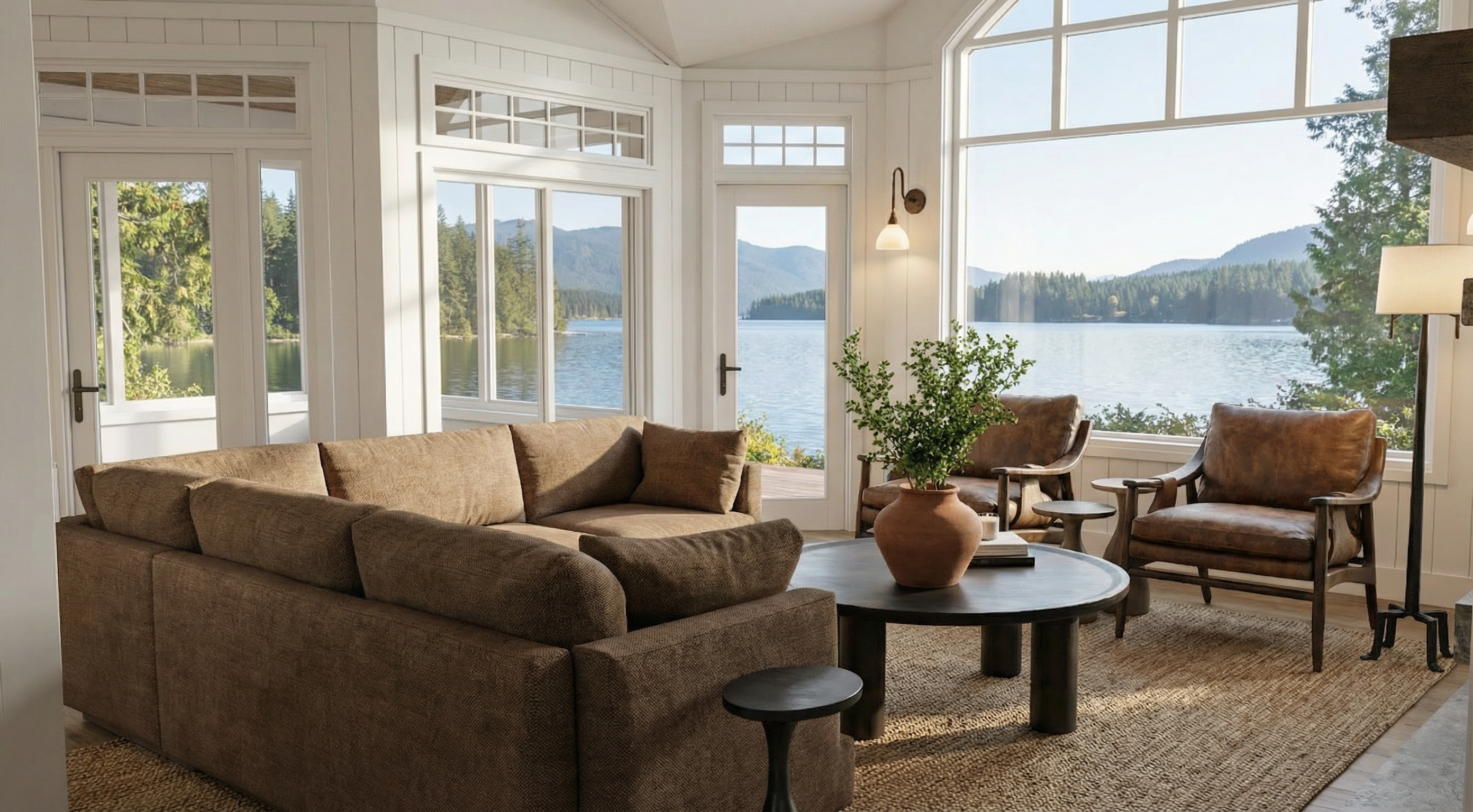 add lake in the background make sofa colour light brown make vase dark brown