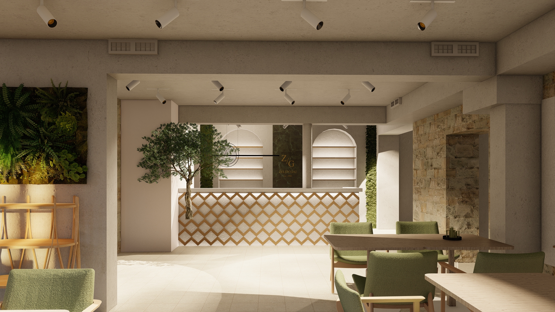 keep everything in the scene exactly the same geometry layout materials and camera angle replace only the white ceiling lights with mediterranean style hanging lamps or chandeliers add a decorative clay or ceramic vase for the olive tree it should look natural and elegant use high quality rendering and warm mediterranean lighting to make the scene realistic and beautiful do not change anything else or lower the image quality