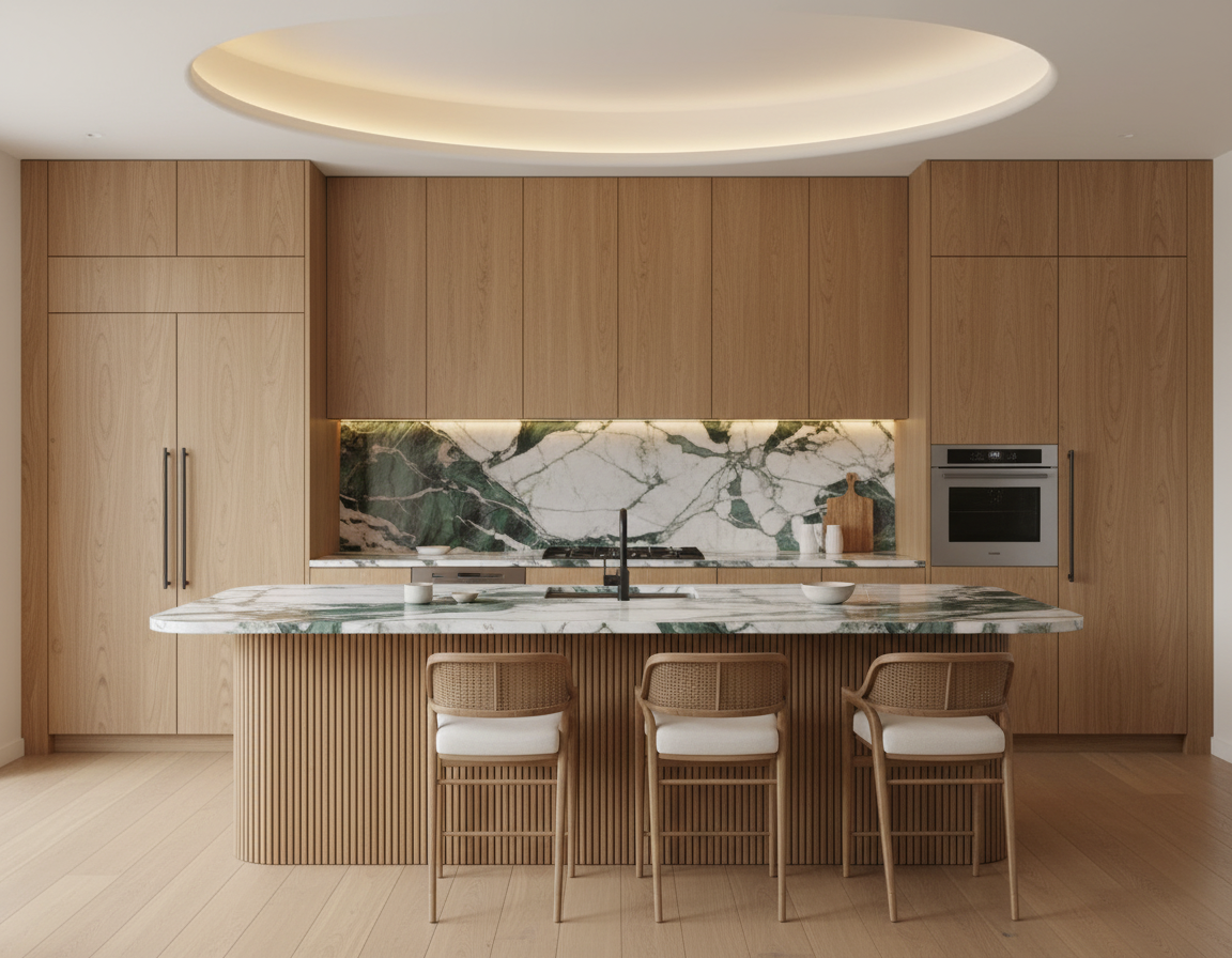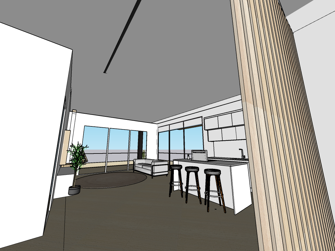 interior shot create a modern and minimalist kitchen and living space with a sophisticated atmosphere the overall color scheme is a blend of neutral tones and natural textures the ceiling and walls are a soft white providing a calming and elegant backdrop the floor features a warm light gloss travertine tile texture adding a touch of coziness to the space the kitchen cabinets are sleek and white with minimalist chrome hardware for a contemporary touch the countertop is a smooth white quartz the bar stools have a black metal frame with a dark walnut wooden seat adding contrast the vertical wooden divider is made of warm bamboo wood creating a warm inviting partition the large windows let in ample natural light with a clear blue sky and soft sand colored landscape outside enhancing the tranquil atmosphere
