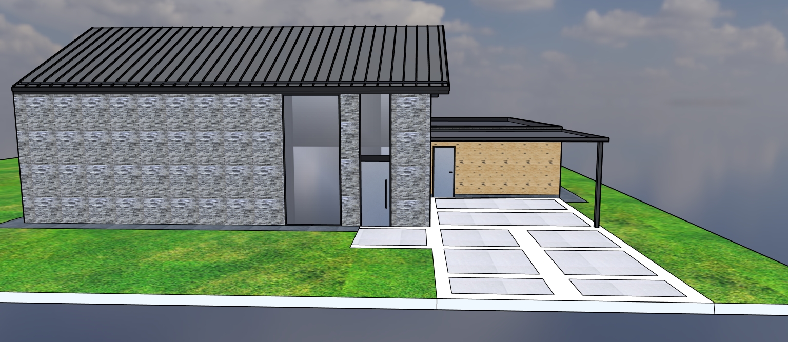 green woods low mountain soft grey stone wall a carport black golfed roof lawn around the house