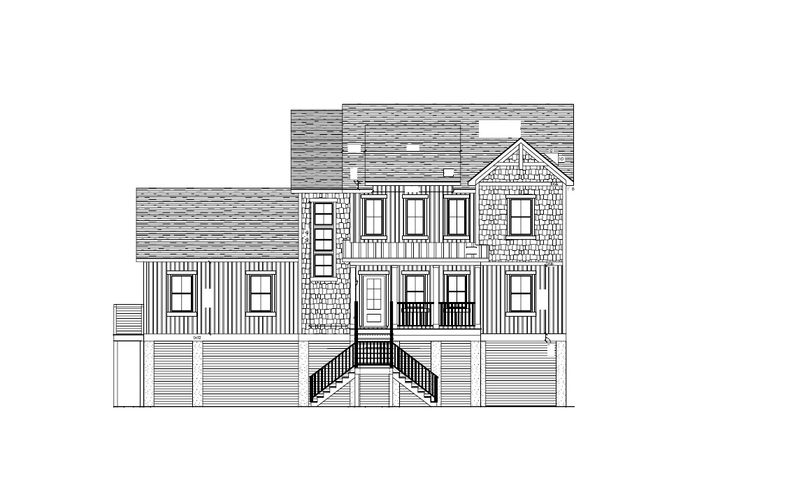 make a front elevation photorealistic as possible while keeping textures the same as shown lightly landscaped in a lightly wooded suburb of beaver falls pa nice lighting remove any text use the following finishes fafbf6 board and batten fafbf6 straight edge vinyl shakes fafbf6 trim black certainteed dimensional shingles 4a3b14 metal roof 3f403e 6 lite glass one panel front door faf7f0 posts and rails unfinished pine horizontal slats and white stucco posts at lower level