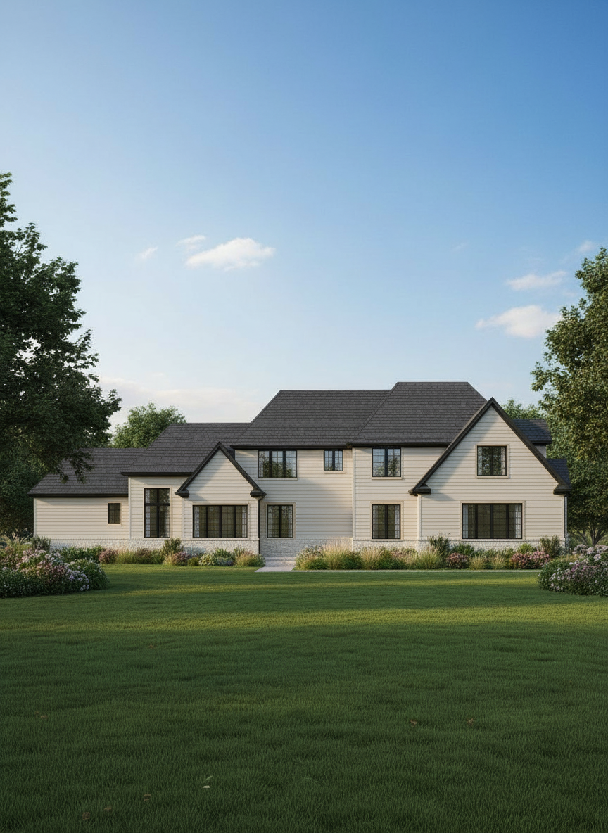 render elevation in vinyl siding of beige color down to grade eliminate all stone or brick windows to be black in color wrapped in beige trim and show dark charcoal dimensional roofing eliminate upper window on right side and fill in with same siding