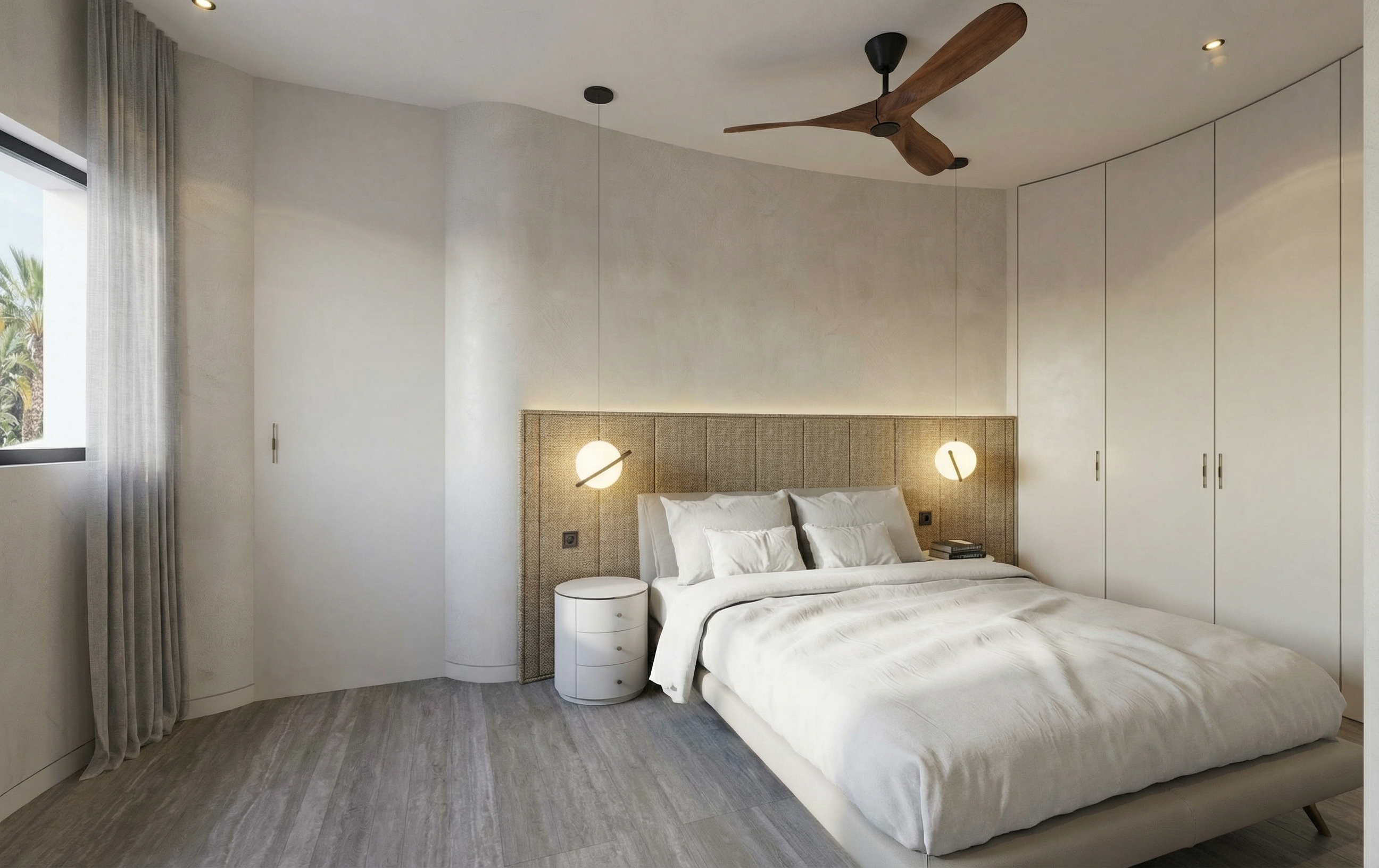 a modern kitchen interior with a minimalist design use soft beige and light cream tones for the walls the ceiling should be in a subtle gray to add contrast include natural wood textures in light oak for the cabinets and shelving the countertops should be a sleek quartz with a gentle brown hue incorporate bar stools with white leather seats and chrome bases the pendant lights should be slender metallic silver adding elegance the floor is covered with polished marble tiles featuring delicate swirls of gold and white the atmosphere is serene and inviting with ample natural light pouring in from large windows elegant object in the kitchen