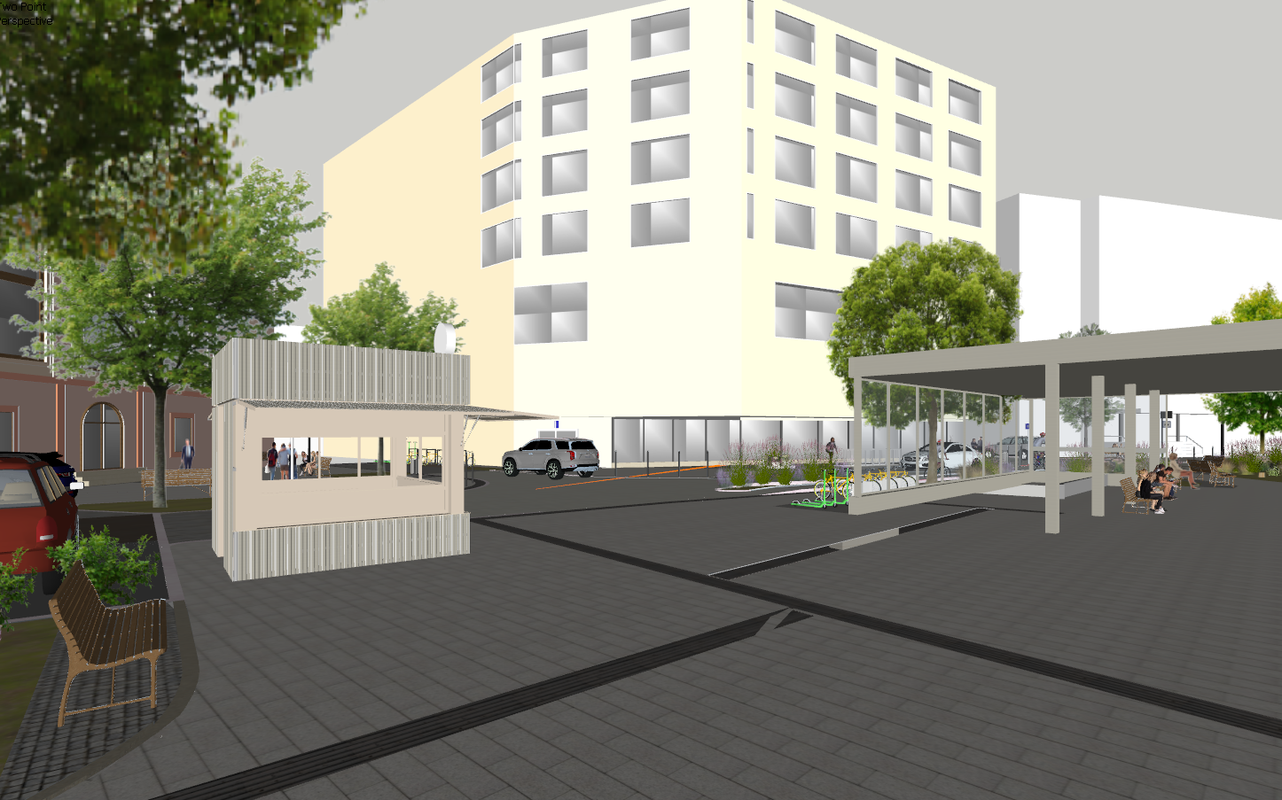 ultra realistic visualization of the imported sketchup model maintain the exact colors of the shelter and kiosk as in the model the kiosk should appear as made of matte sheet metal no reflections no gloss include realistic lighting and shadows that match a natural outdoor environment preserve all proportions textures and architectural details exactly from the sketchup scene high resolution render cinematic realism attention to fine material details