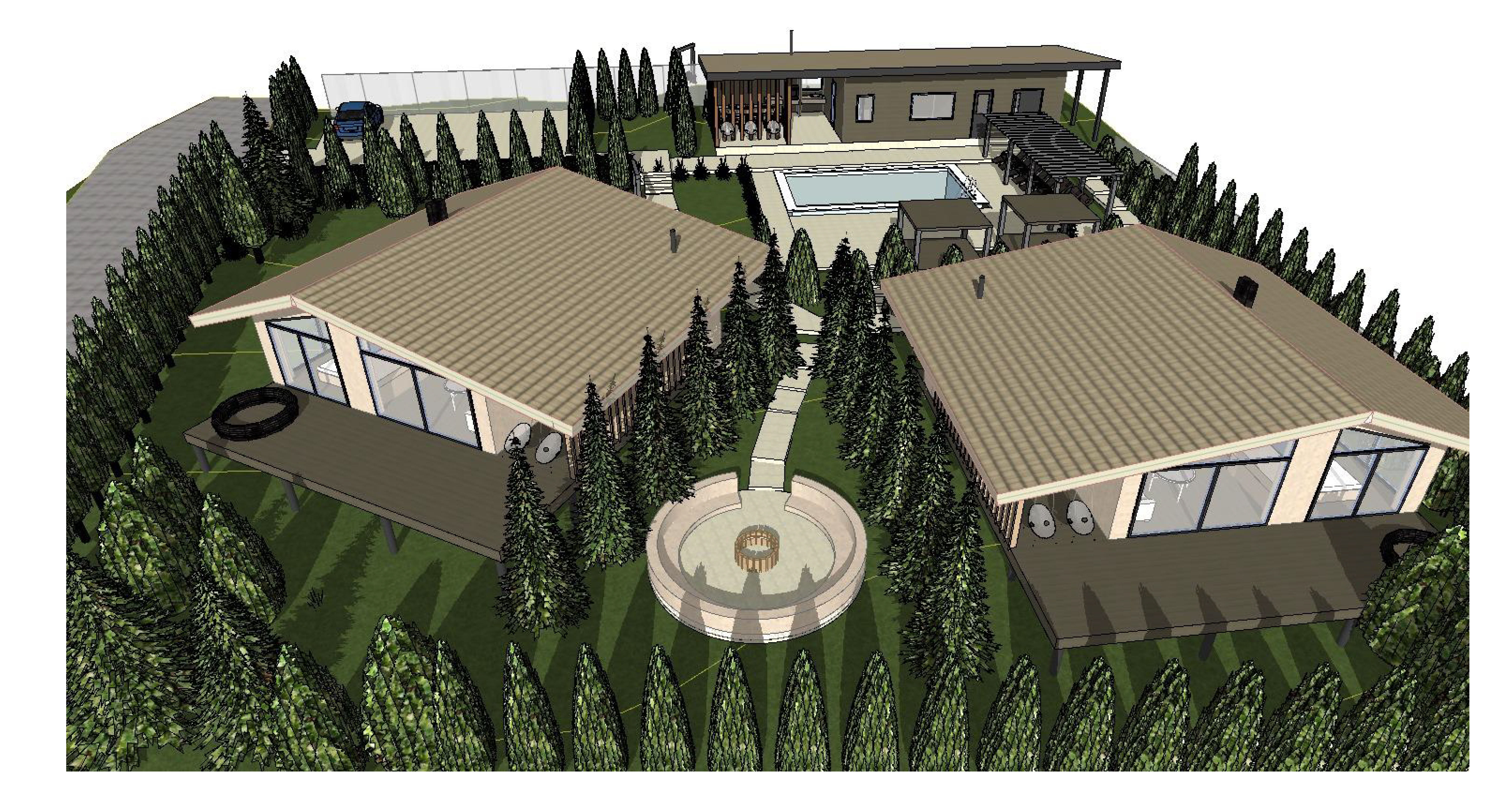 barndominium exterior shot houses in a forest in mountain sunny morning black metal roof black windows black doors wood accent and wooden finishes water in the pool architecture