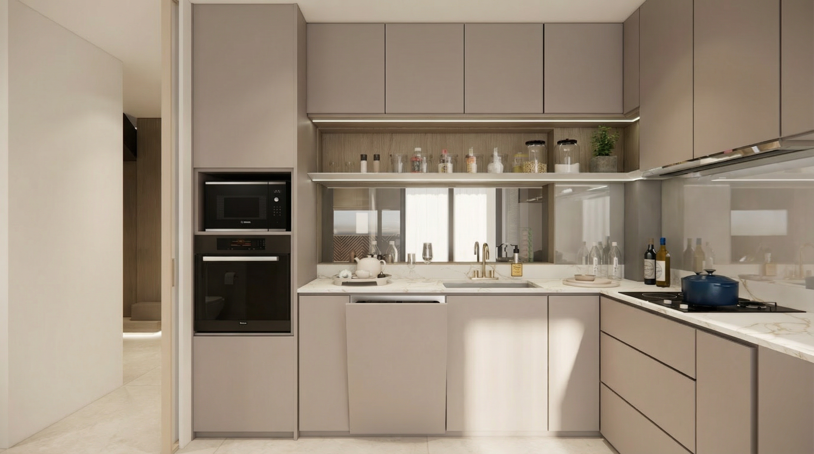 the kitchen cabinet color needs to be approximately 10 darker while keeping the same original color tone enhance the linear led light strips under the cabinets and shelves increase the under shelf lighting brightness to approximately 600 lux ensuring even and realistic illumination do not change the design layout camera angle or material selection maintain all original materials and finishes focus on realistic lighting accurate shadows and natural looking material textures produce a clean professional photorealistic kitchen render