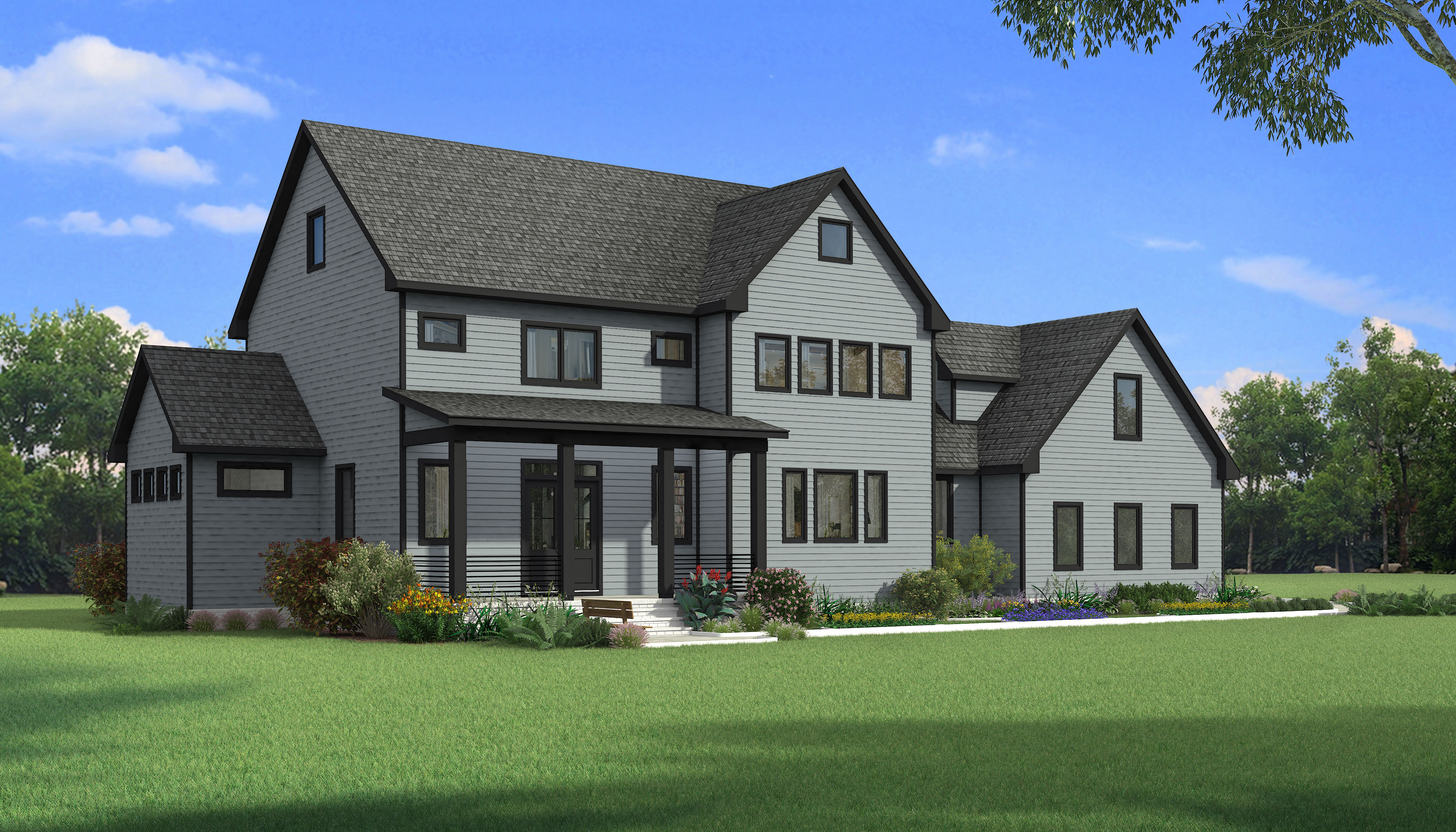 render this in a christmas setting with snow and lights add lights along the eaves and gables and a snowman in the front yard setting is at night