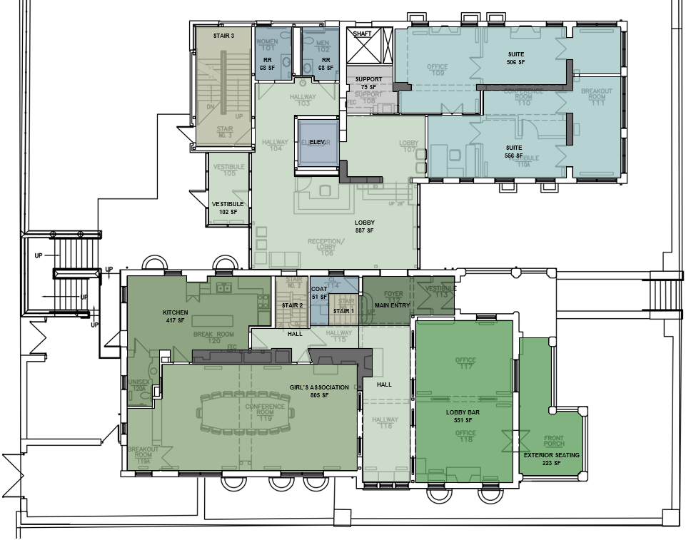 historic hotel floor plan illustration in plan view clean minimal and diagrammatic with soft hand drawn line quality and subtle sketch texture clearly distinguish suites lobbies bars restaurants clubs stairwells and corridors with restrained line weights and hierarchy calm muted warm color palette emphasizing neutral floors soft wood tones and gentle accent colors for furniture and feature areas professional quiet competition ready and visually legible evoking a historic yet contemporary presentation drawing without photorealism or perspective distortion keep the image 2d and remove all furniture and labels