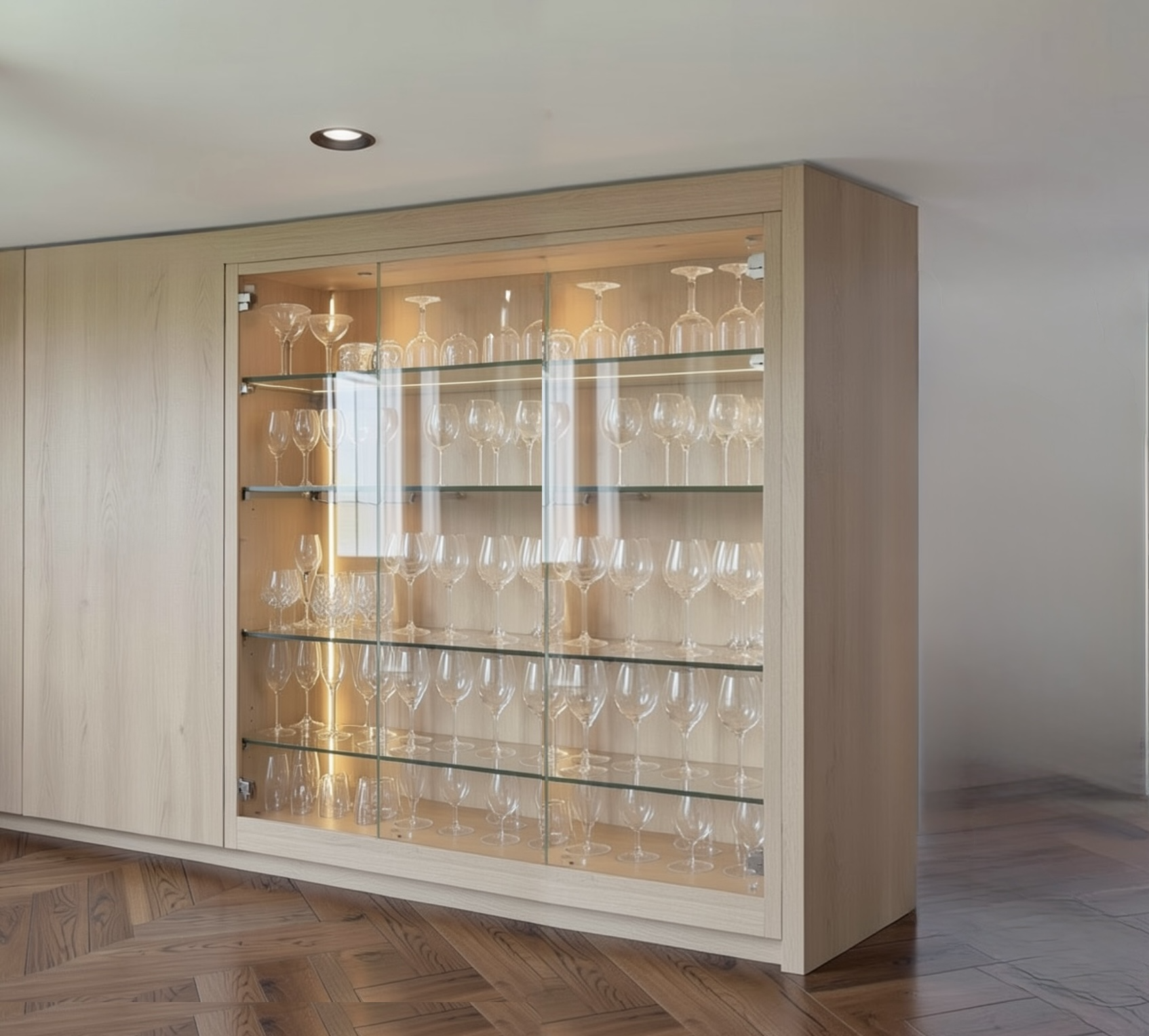 make glass cabinet double in width and all crystal wine glass storage make cabinetry in light oak and floors in herringbone matte walnut finish