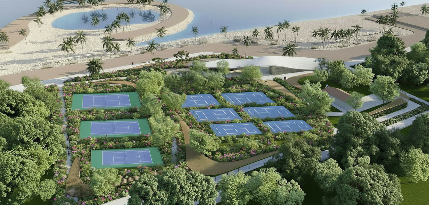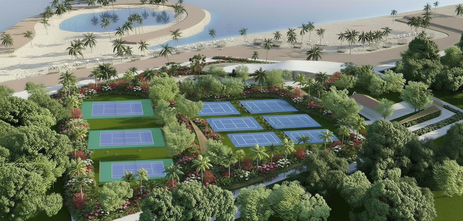 add small bushes between the courts add tennis court fencing and padel court fencing dont change the courts placed from the original image
