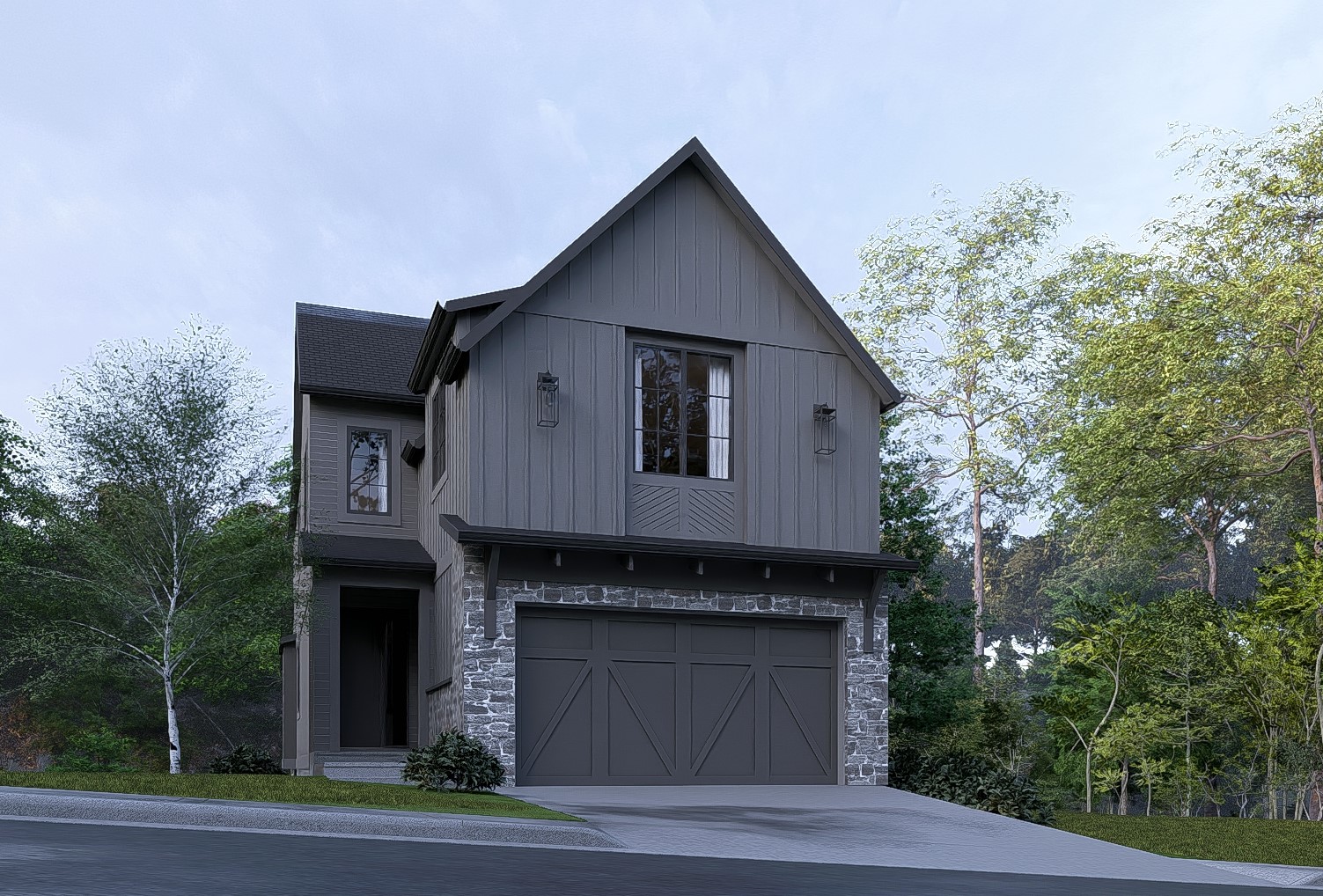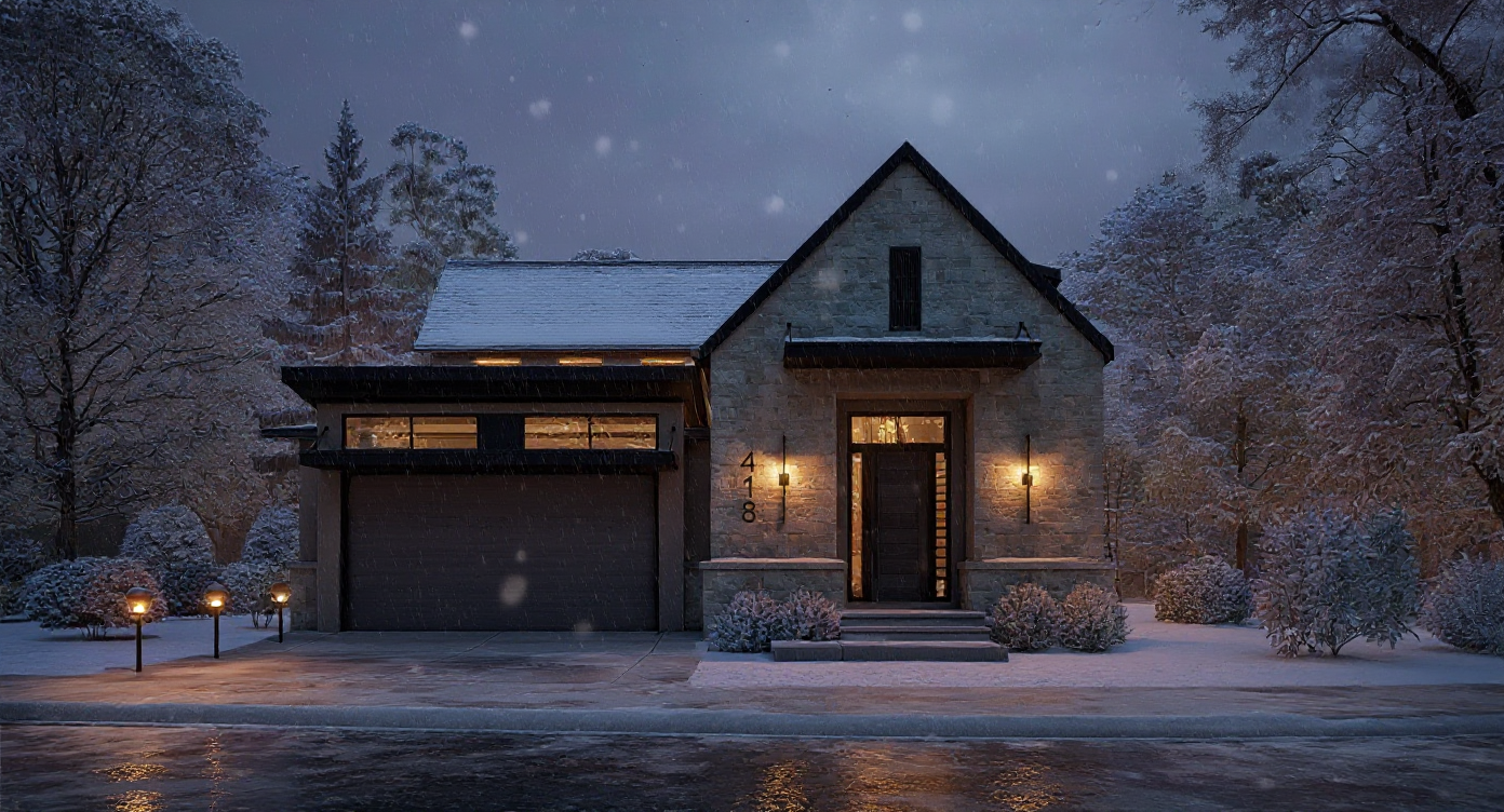 transform this rendering into a warm winter scene add fresh soft snowfall on the rooflines landscape and hard surfaces introduce warm ambient lighting that creates a cozy inviting glow from the windows and subtle golden highlights on exterior materials include gentle snow accumulation on railings ledges and vegetation with light flakes falling in the air maintain all architectural details and proportions while enhancing the overall atmosphere to feel like a serene warm winter day add christmas lights