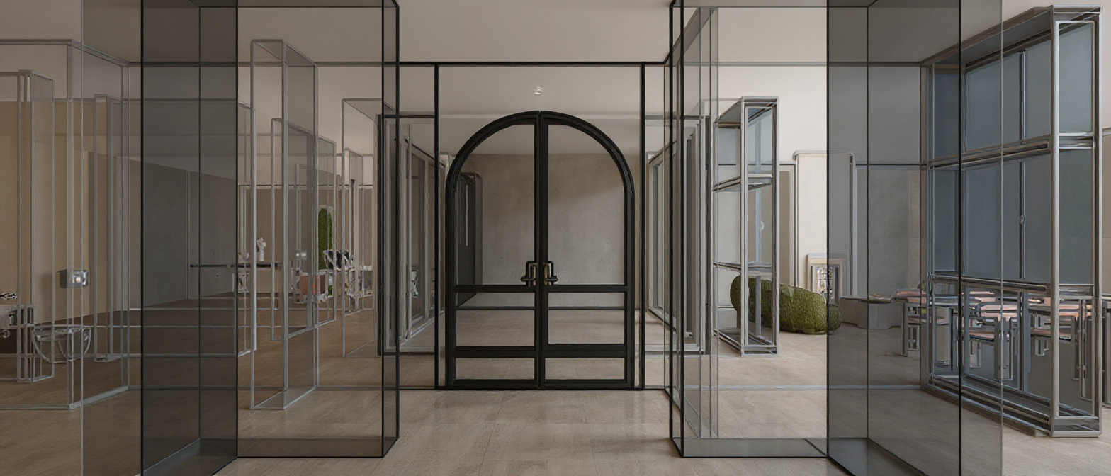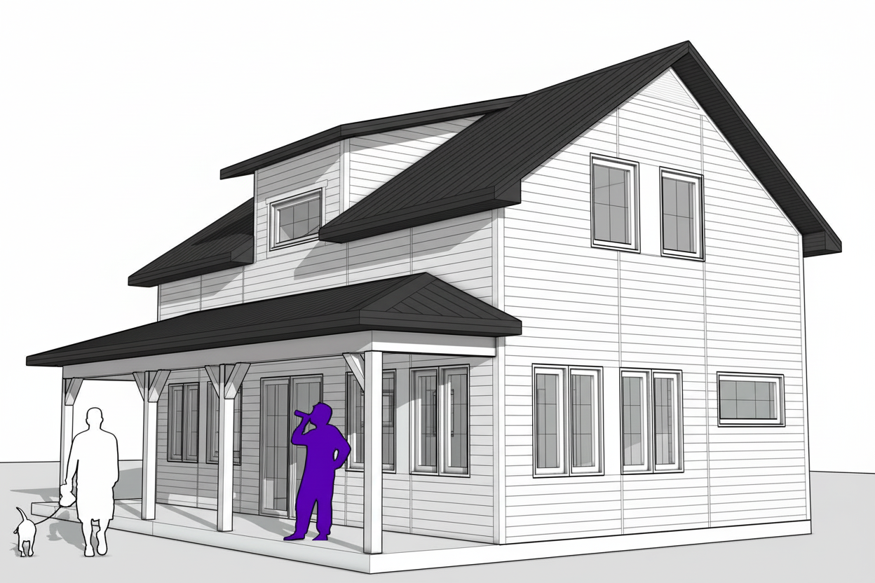 white building white window frames sunset light intense green garden around lawn around the house delicate light from exterior