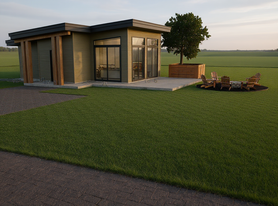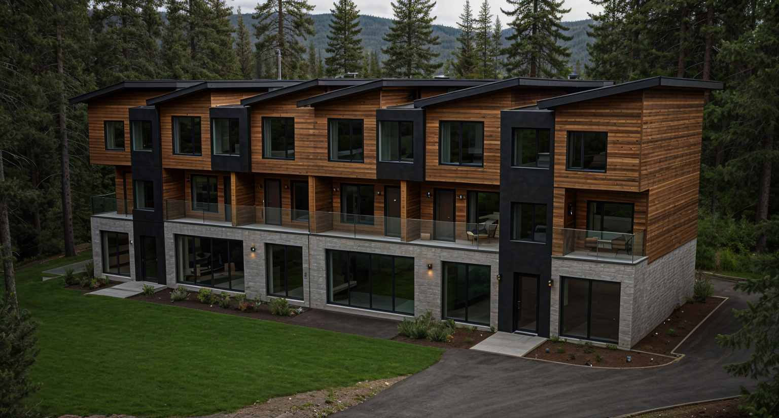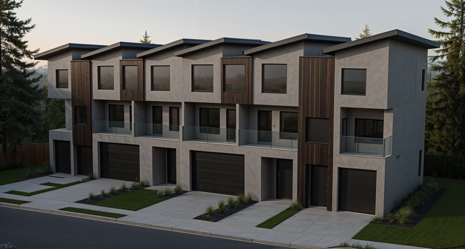 render this townhome building in a west coast modern style keeping all existing geometry and proportions exactly as shown use a rich yet balanced material palette featuring dark metal panels smooth fiber cement or stucco in warm grey tones and moderate accents of natural wood such as vertical cedar cladding or soffit details to introduce warmth each vertical roof segment should read as a distinct unit by subtly varying the material combinations alternate between darker metal lighter grey panels and wood tones for contrast and rhythm the large doors on the lower level are garage doors and should appear as modern dark aluminum or composite panel styles not wood include black framed windows clean detailing and restrained trim lighting should be soft and natural to highlight textures and shadow lines the surrounding landscape should be minimalist and modern with low plantings and concrete or paver walkways consistent with west coast modern design