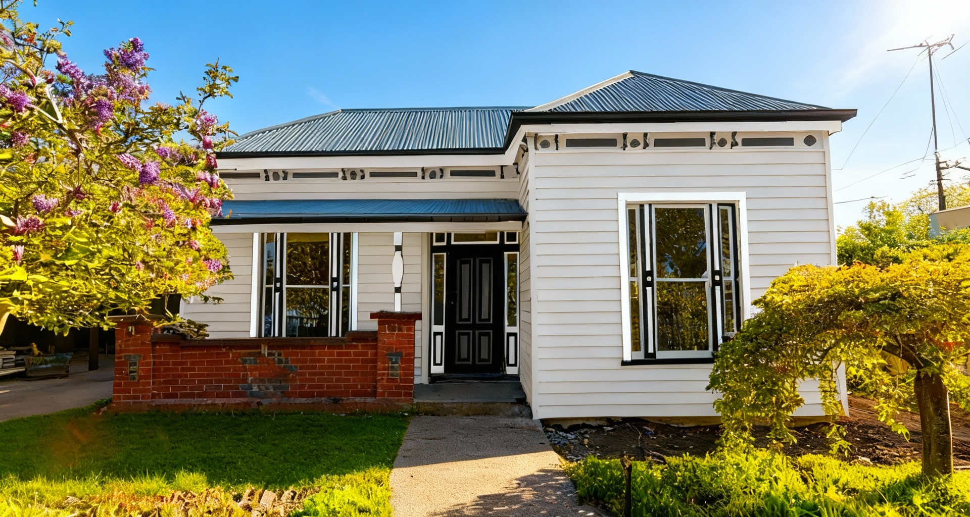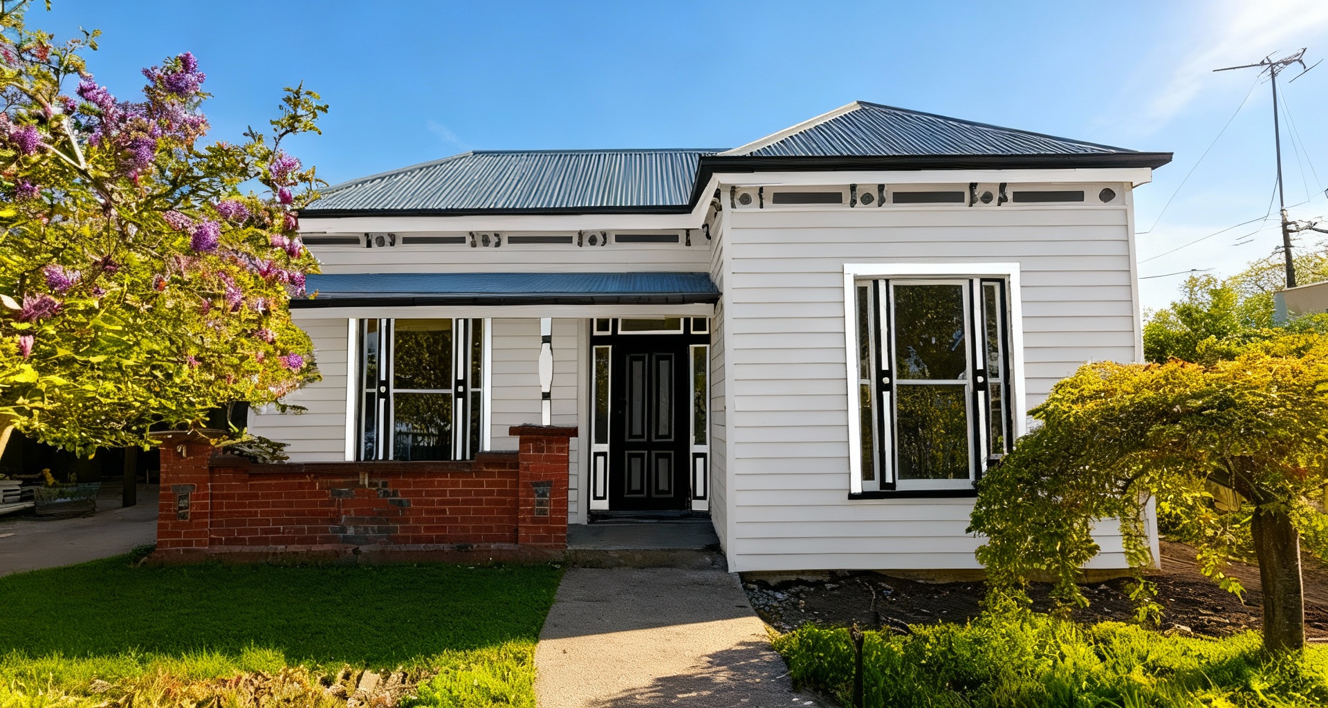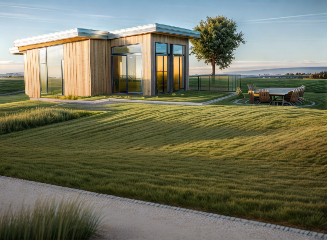 render this townhome building in a west coast modern style keeping all existing geometry and proportions exactly as shown use a rich yet balanced material palette featuring dark metal panels smooth fiber cement or stucco in warm grey tones and moderate accents of natural wood such as vertical cedar cladding or soffit details to introduce warmth each vertical roof segment should read as a distinct unit by subtly varying the material combinations alternate between darker metal lighter grey panels and wood tones for contrast and rhythm the large doors on the lower level are garage doors and should appear as modern dark aluminum or composite panel styles not wood include black framed windows clean detailing and restrained trim lighting should be soft and natural to highlight textures and shadow lines the surrounding landscape should be minimalist and modern with low plantings and concrete or paver walkways consistent with west coast modern design