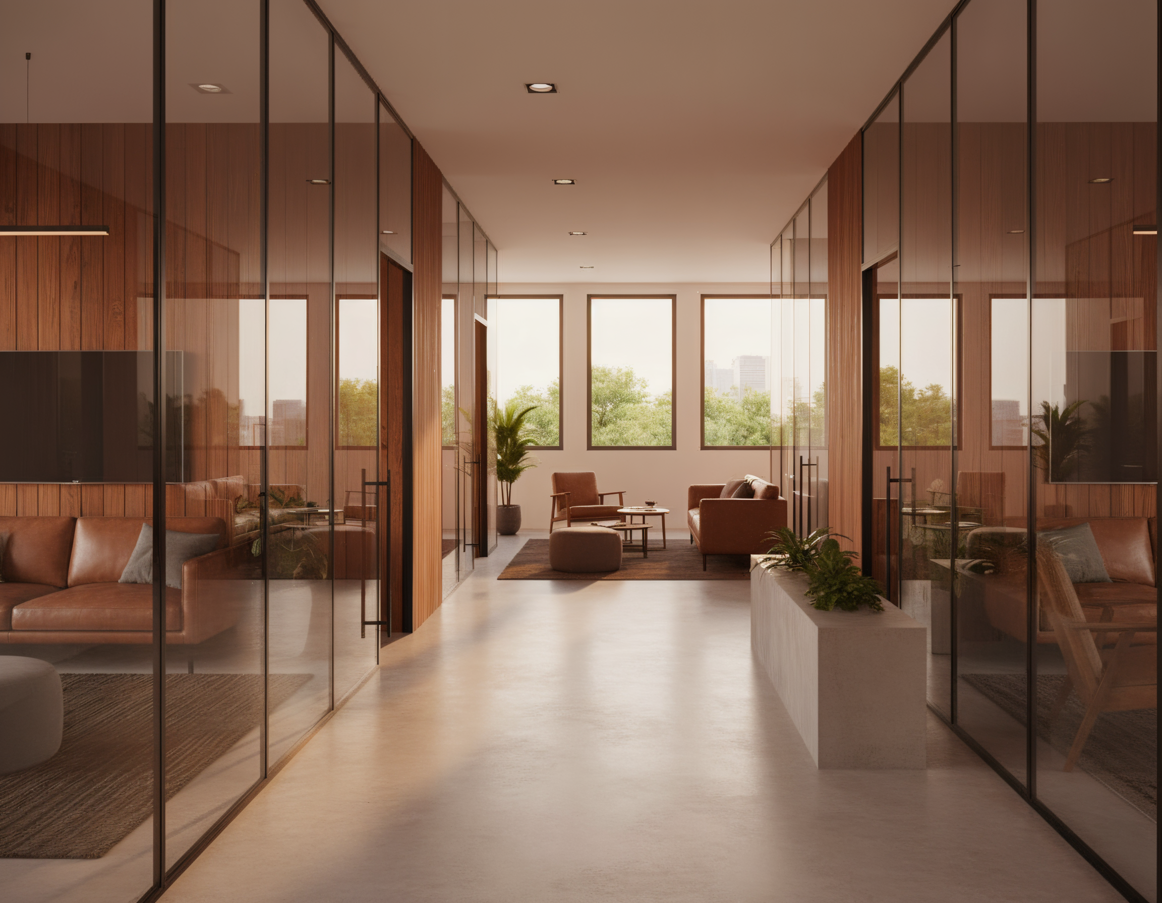 create a perspective visualization the viewpoint is the point where the red angle in the plan view of the reference drawing intersects adhere precisely to the floor plan maintain the exact window dimensions utilize this specific space and integrate the atmosphere and materials of the reference images you are standing in an office with black glass partitions on the left you can partially see a desk with a monitor at the lowest point of the image your gaze falls upon three windows overlooking trees you are on the third floor of a townhouse and can see the treetops and the houses opposite the area in front of the three windows is a common area with a couch to the left of the windows is a curved wall add furniture and people