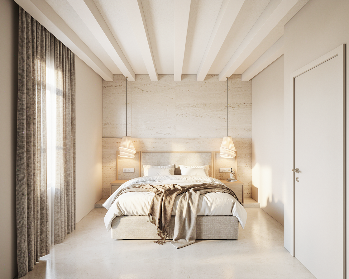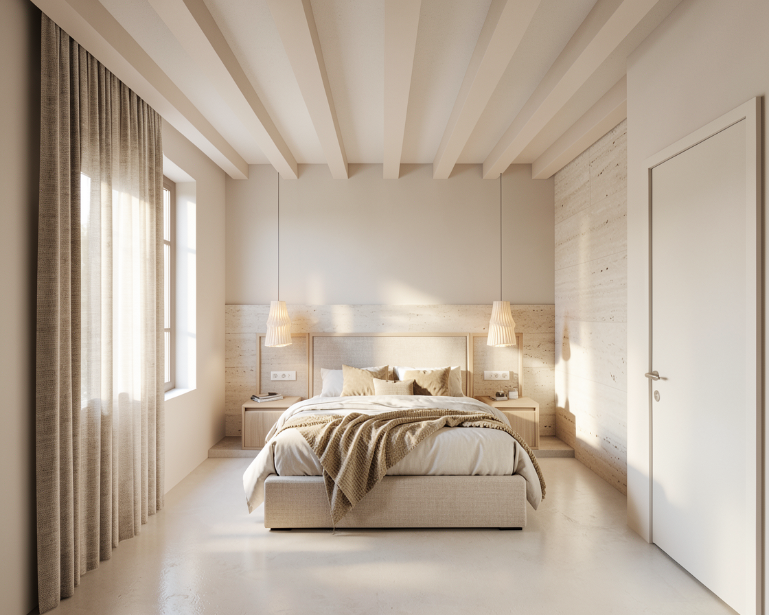 create a high end photorealistic render of a bright luxurious bedroom with a refined and expensive feel the materials should feel authentic with realistic texture the flooring is matte with a polished cement look in a sand off white shade cohesive and elegant the lighting should be warm natural and balanced maintaining a bright atmosphere add beautifully arranged high quality bed linens with soft folds and a soft aesthetic the overall mood should feel contemporary sophisticated bright and editorial as if photographed for a luxury interior design magazine keep the initial materials like cotton linen the headbed travertino light oak wood the pendant lights above the nightstands has a fabric like surface has fine pleats forming two overlapping layers that create a dynamic textured look the headbed sand beige fabric around the wood cornice and the other material on the wall until thwe half one is travertino and the other half wall off white