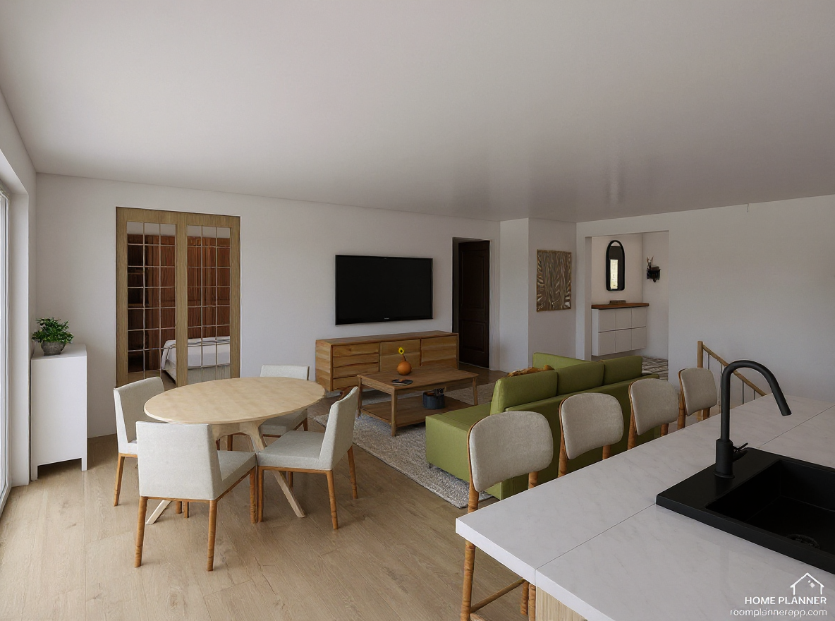 render to a 3d image with linen color vinyl siding and a front door with sidelites brown shutters and natural wood porch beams and prairie style windows