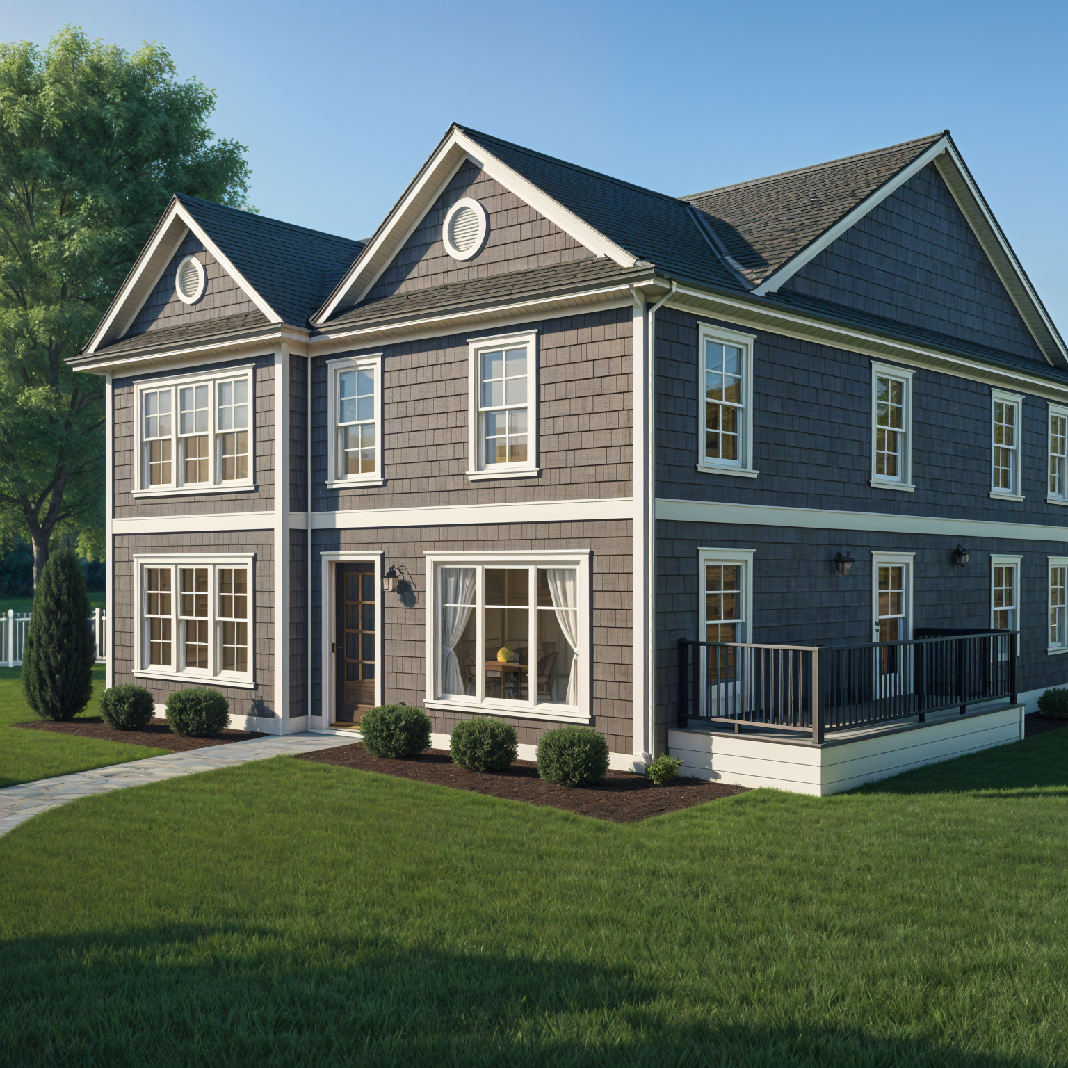 exterior shot enhance the clarity and texture of the grey siding exterior walls and the glass windows add realistic lighting effects including soft natural sunlight that highlights the architecture include well maintained landscaping with lush grass additional trees and subtle shadowing from the building and surrounding trees adjust the sky to a bright clear day to give a vibrant yet polished atmosphere refine the reflections on the windows to enhance the depth and dimension of the glass making the overall scene look more immersive and lifelike this prompt emphasizes improving realism while keeping the overall architectural and environmental context clean and professional architecture