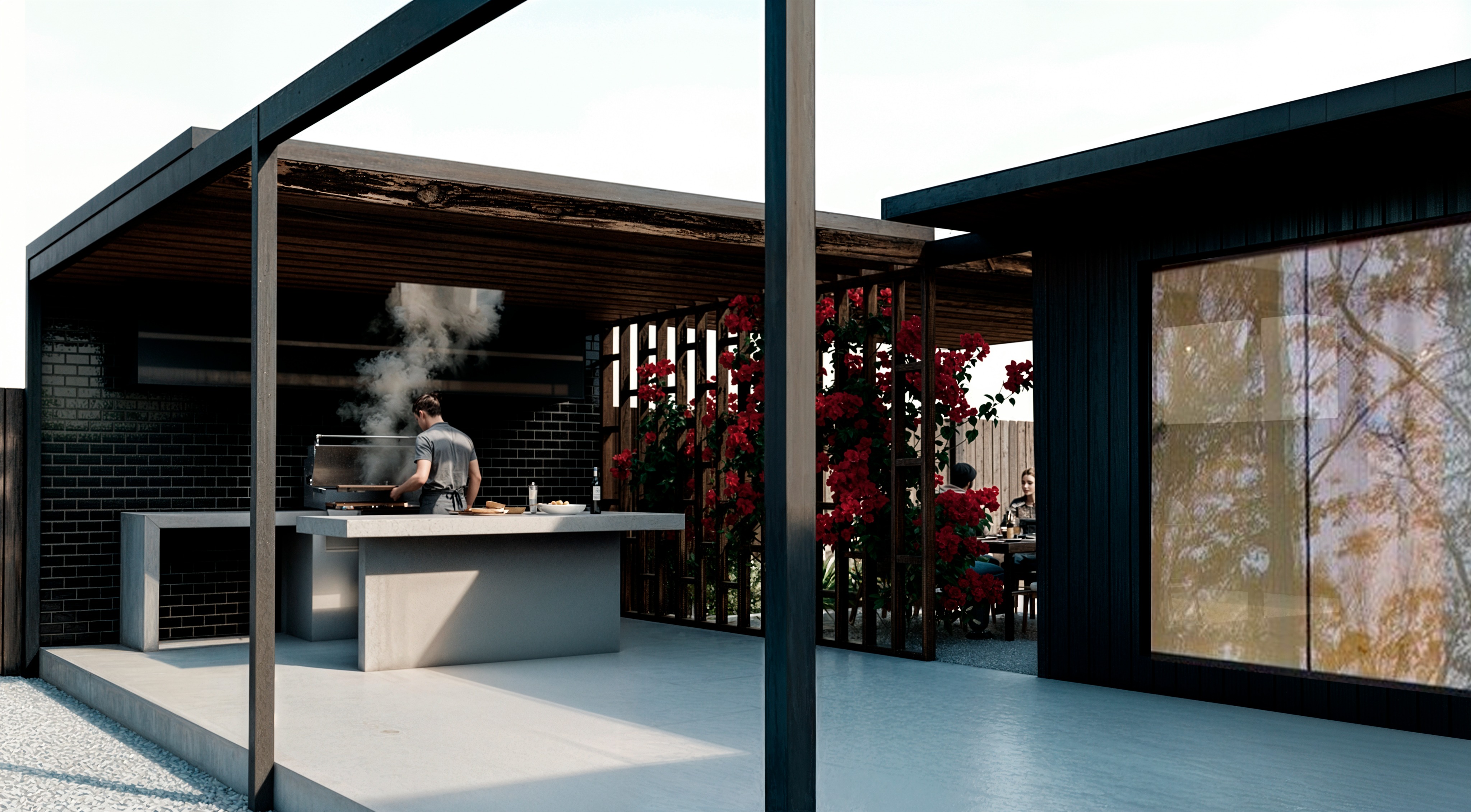 architectural visualization of an open air quincho outdoor barbecue pavilion approximately 4x4 meters cementitious flooring with a strong concrete appearance light to medium gray matte finish black ceramic elements clearly visible and defined strong presence of dark wood elements throughout the project with dark stained wood used in finishes and details structural columns and beams made of metal in deep graphite gray ceiling made of dark pine wood slats rich and warm in tone built in concrete furniture and countertops with a raw minimalist finish emphasizing the contrast with the dark materials behind a dark wood lattice screen a bougainvillea climbing and weaving through the lattice with red colored leaves adding vibrant contrast a person grilling at the built in concrete barbecue subtle smoke rising and several people seated on chairs around a table relaxed and social atmosphere behind the quincho a small patio finished with light gravel shells conchuelas and in the background a vertical dark wood fence modern minimalist chilean residential architecture realistic human scale natural interaction soft natural daylight high detail architectural render style
