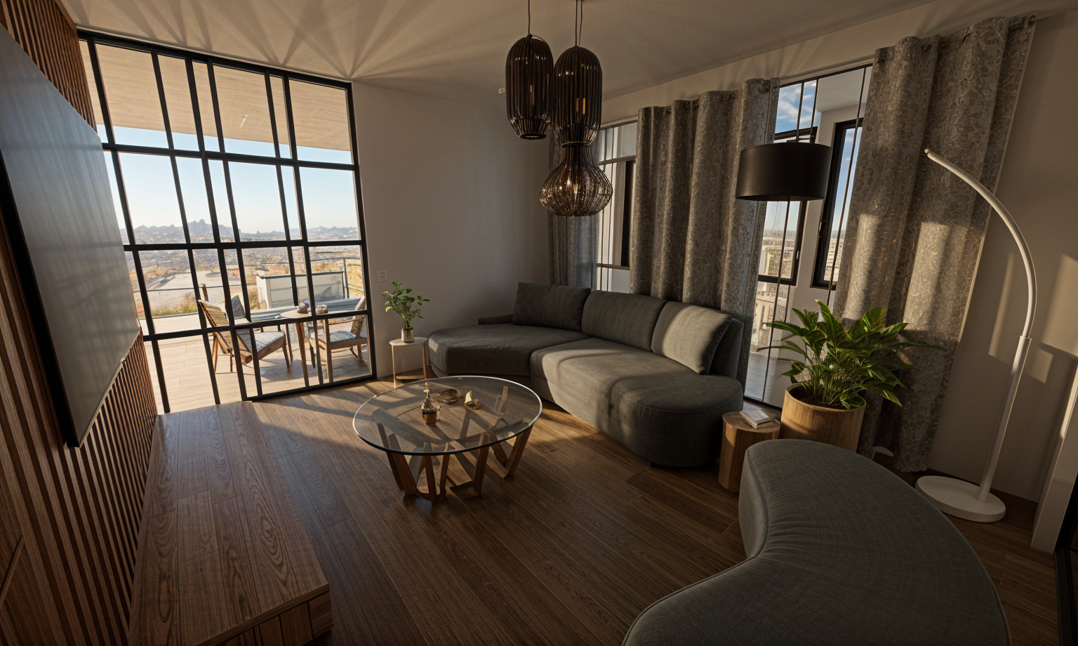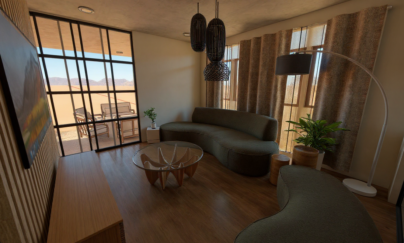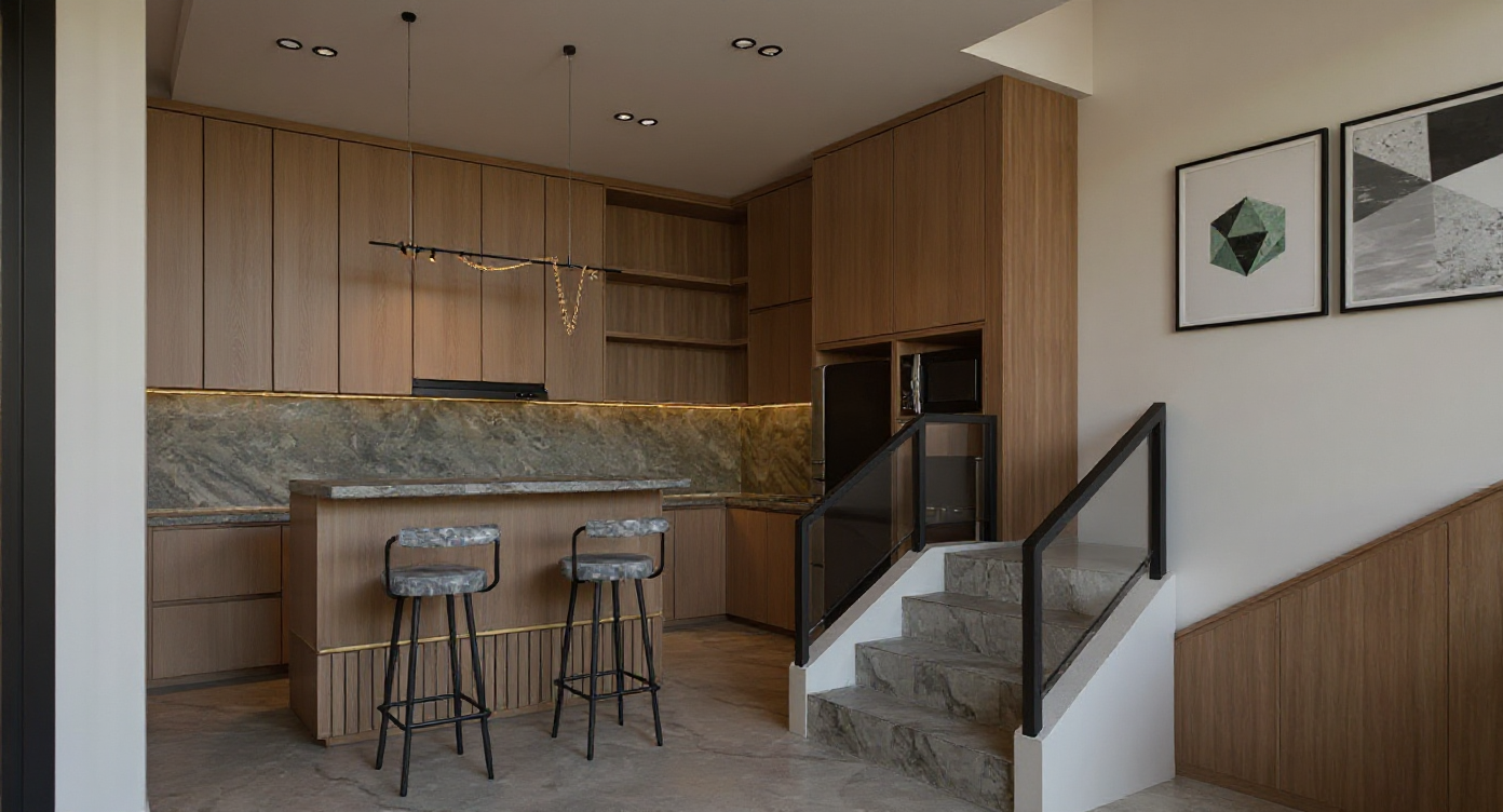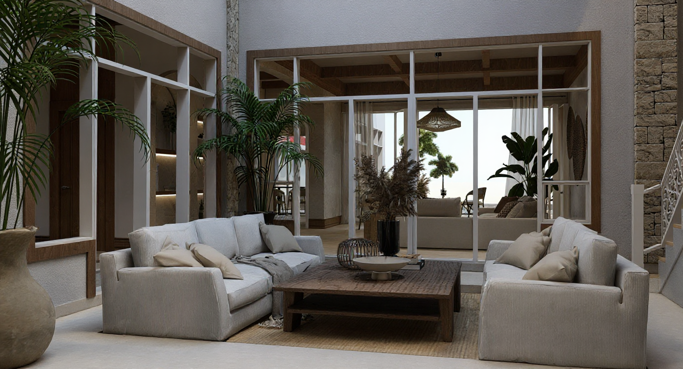 render a serene suburban scene with modern two story homes featuring cream colored walls and dark brown accents complemented by red brown tiled roofs in the foreground a beautifully landscaped garden showcases lush green grass and neatly trimmed hedges a round tranquil pond with a gentle fountain lies in the center its water reflecting a clear blue sky the atmosphere is calm and inviting with a large comfortable circular outdoor chair in light gray tones paired with soft beige cushions surrounding plants and trees in vibrant greens enhance the peaceful vibe a touch of sunshine casting soft shadows on the walls and ground the overall mood is warm and peaceful perfect for an idyllic afternoon