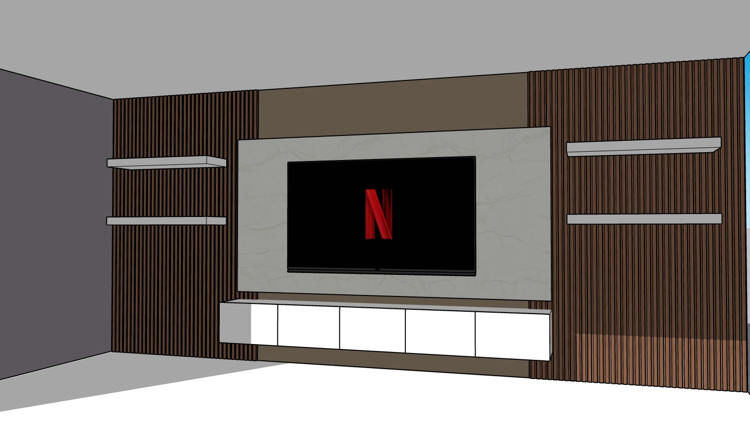 modern interior living room design featuring a sleek entertainment wall the central focus is a large flat screen tv with a minimalist design surrounding the tv the wall is clad in rich walnut wooden slats adding a touch of warmth the back panel is a luxurious marble texture in a light beige tone below the tv a matte white floating cabinet offers storage contrasting beautifully with the wooden backdrop on either side of the tv two minimalist matte white shelves provide balance the room s atmosphere is modern and inviting with a neutral color palette and soft lighting creating a cozy sophisticated ambiance