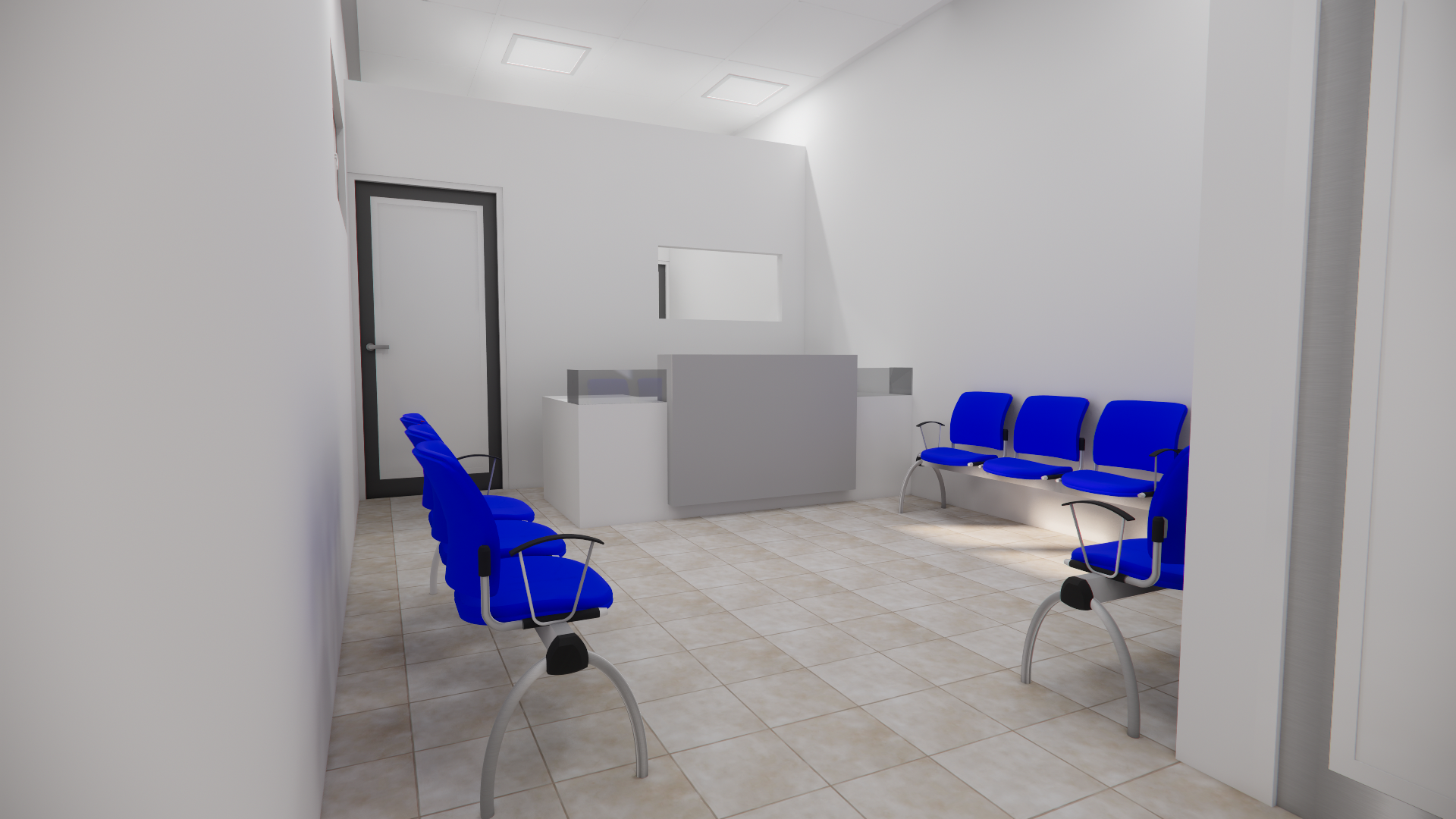 a realistic interior render of a small clinic reception area maintaining the exact architectural layout with a central reception desk waiting chairs aligned along the walls and a clean circulation path white walls with slight tonal variation and soft imperfections paired with light beige ceramic tile flooring showing natural grout and slight wear reception desk in matte light grey finish with a slightly reflective countertop subtle edge detailing and minor surface imperfections add realistic reception elements a desktop computer keyboard mouse a small stack of documents a pen holder and a discreet label or clinic name signage on the front waiting area with blue upholstered chairs featuring visible fabric texture and slight wear on edges metallic legs with soft reflections keep alignment as modeled but introduce slight natural variation in positioning enhance realism with minimal decor 2 3 framed wall prints abstract or soft medical themed graphics with thin black or metallic frames slightly misaligned for realism add 2 3 indoor plants snake plant or small ficus in simple neutral pots placed in corners and near the reception desk include subtle clinical details wall mounted hand sanitizer dispenser near the entrance small directional signage and a discreet waste bin near the desk ceiling with recessed led panels neutral white 4000k soft uneven light distribution to avoid perfect uniformity add gentle shadows realistic ambient occlusion and slight reflections on floor tiles and metal elements keep the environment clean but not sterile perfect faint scuffs on floor joints slight discoloration near high touch areas and subtle variation in materials camera at eye level slightly angled toward the reception desk to capture depth and seating arrangement no people overall mood functional welcoming modest healthcare space with believable everyday use