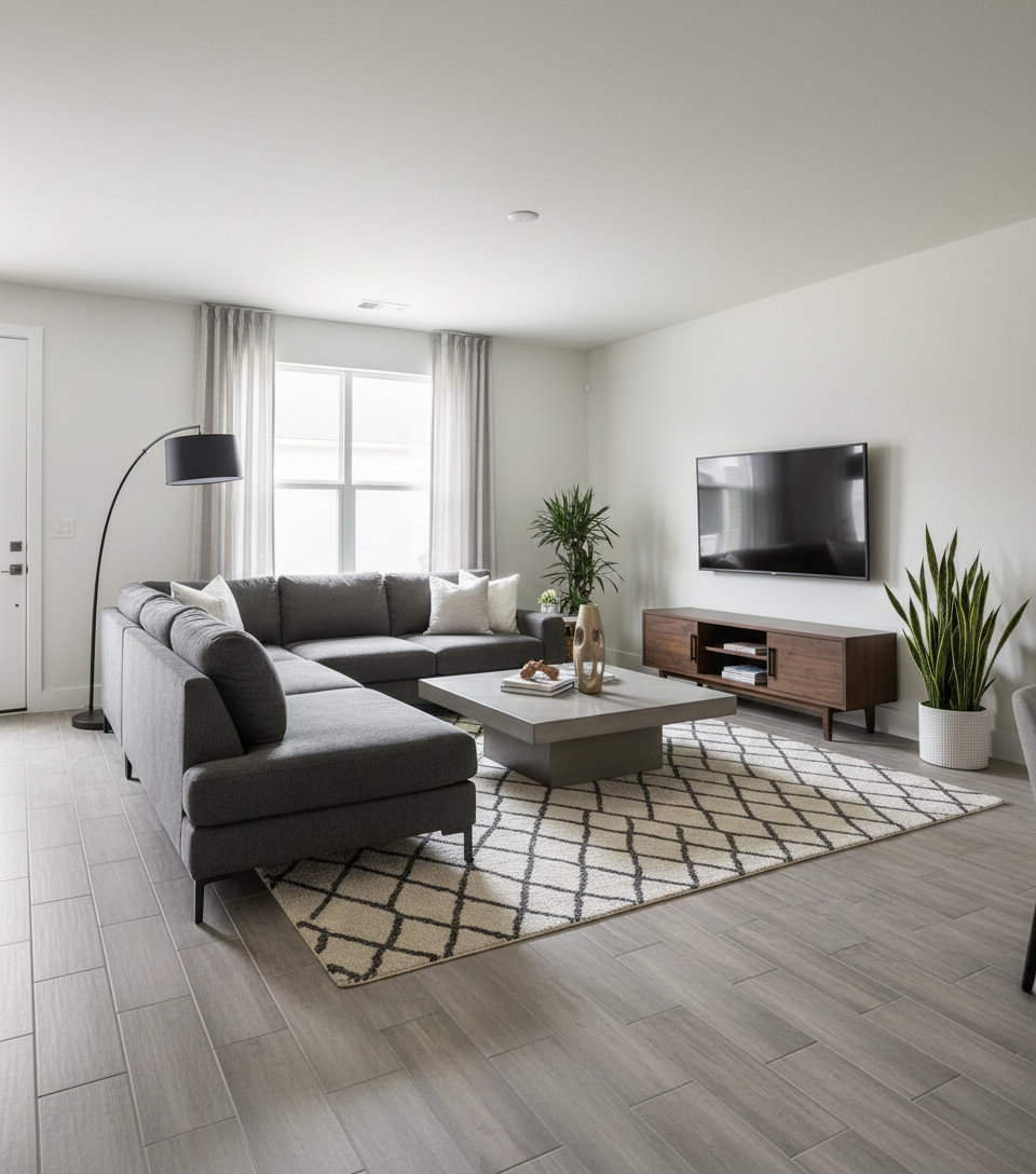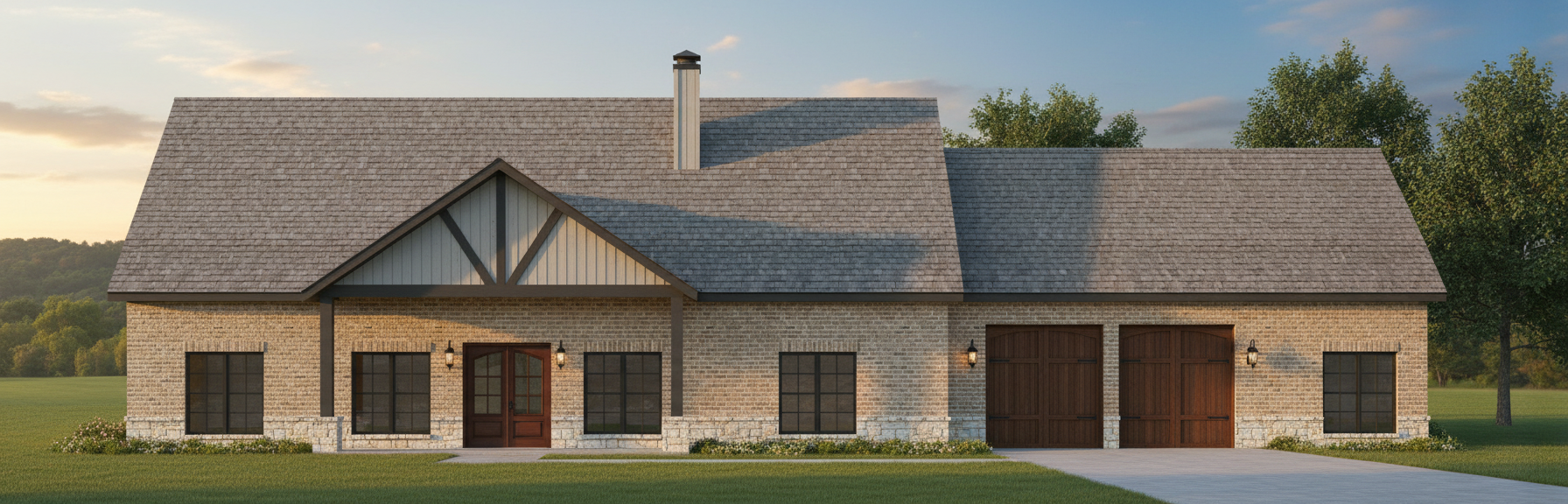 render a charming country house with a gabled roof painted in a soft cream color with light brown wooden accents the windows are large and outlined with dark black trim the front door is crafted from rich mahogany wood the garage door is a black shade featuring elegant details illuminate the exterior with warm golden lanterns on either side of the entrance set the scene during a clear bright morning where the sunlight casts gentle shadows on the fa ade surround the house with lush greenery and a few vibrant colorful flowers for a serene countryside atmosphere