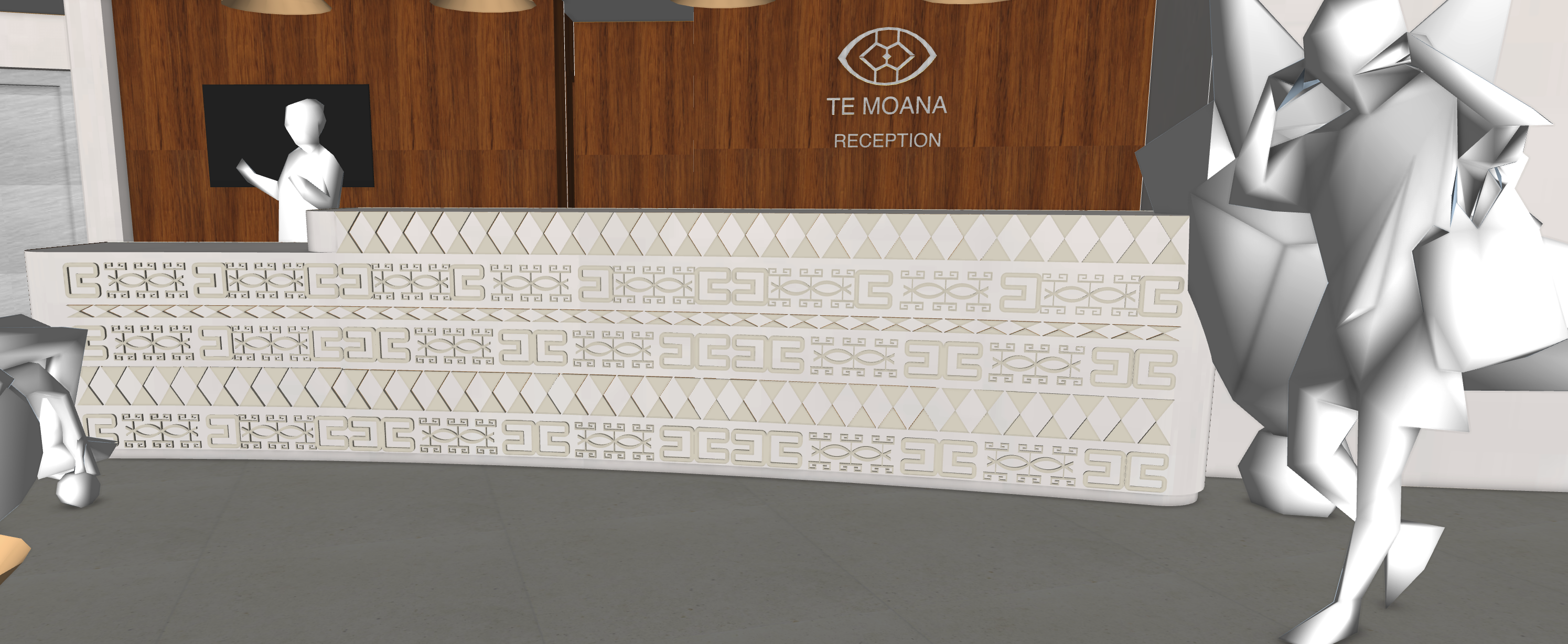 exterior shot stylized reception area with geometric sculptures and intricate patterns wooden wall with warm reddish brown tones elegant white reception counter with beige and gray polynesians patterns ambient lighting creates a calming sophisticated atmosphere smooth polished gray floor architecture