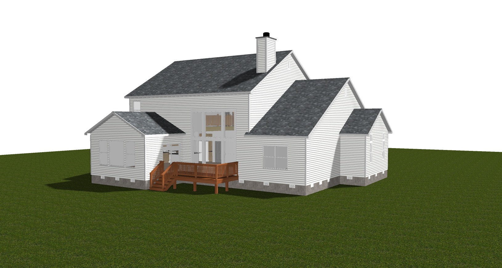 make this rear elevation photorealistic while keeping textures and architectural elements the same as selection add professional landscaping on a lightly wooded scene with good lighting that is in highlands north carolina use the following colors and materials lap siding to be c7c8ca in color corner boards to be c7c8ca in color shingle roofs are to be certainteed dimensional shingles in pewter windows to be white in color window trim to be white in color fascia to be white in color soffit to be white in color eaves to be white in color gutters and downspouts to be white in color deck to be stained ebony handrail to be stained ebony exterior lantern wall fixture at sliding glass patio door to be matte black foundation to be poured wall concrete