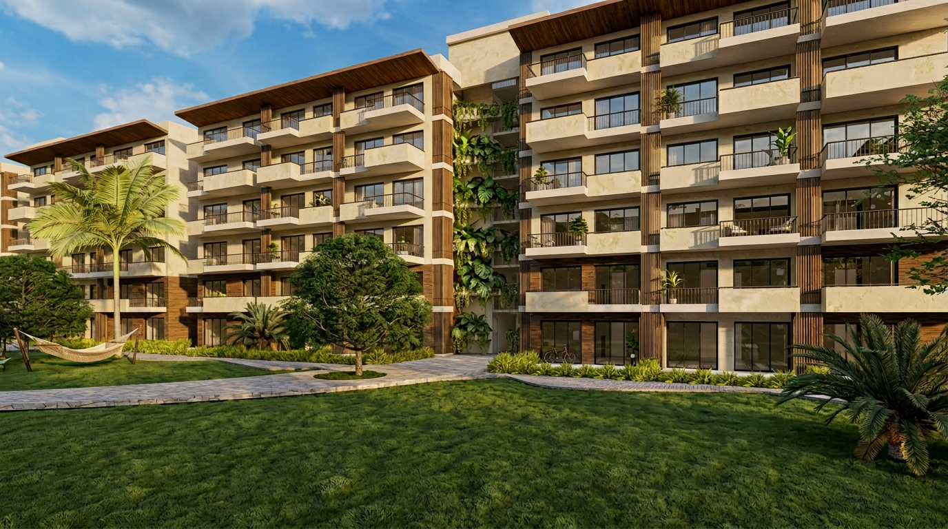 create a realistic photograph of an exterior image in a plot near a small town the roof has dark orange roof tiles the base walls of the building are plaster in green grey color the first floor is in wood panels the garden has nice and wild gras not so tall keep the geometry of the building