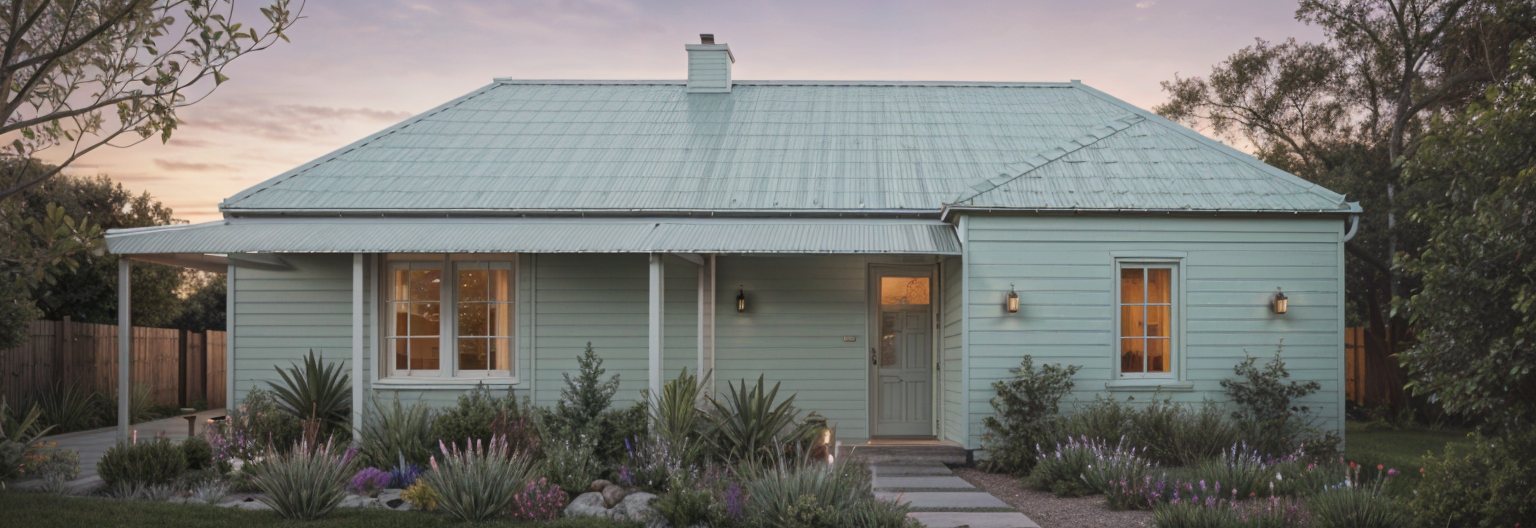classical exterior shot in an australian rural setting at sunset with a lush green garden external colour pallette of white and soft grey architecture