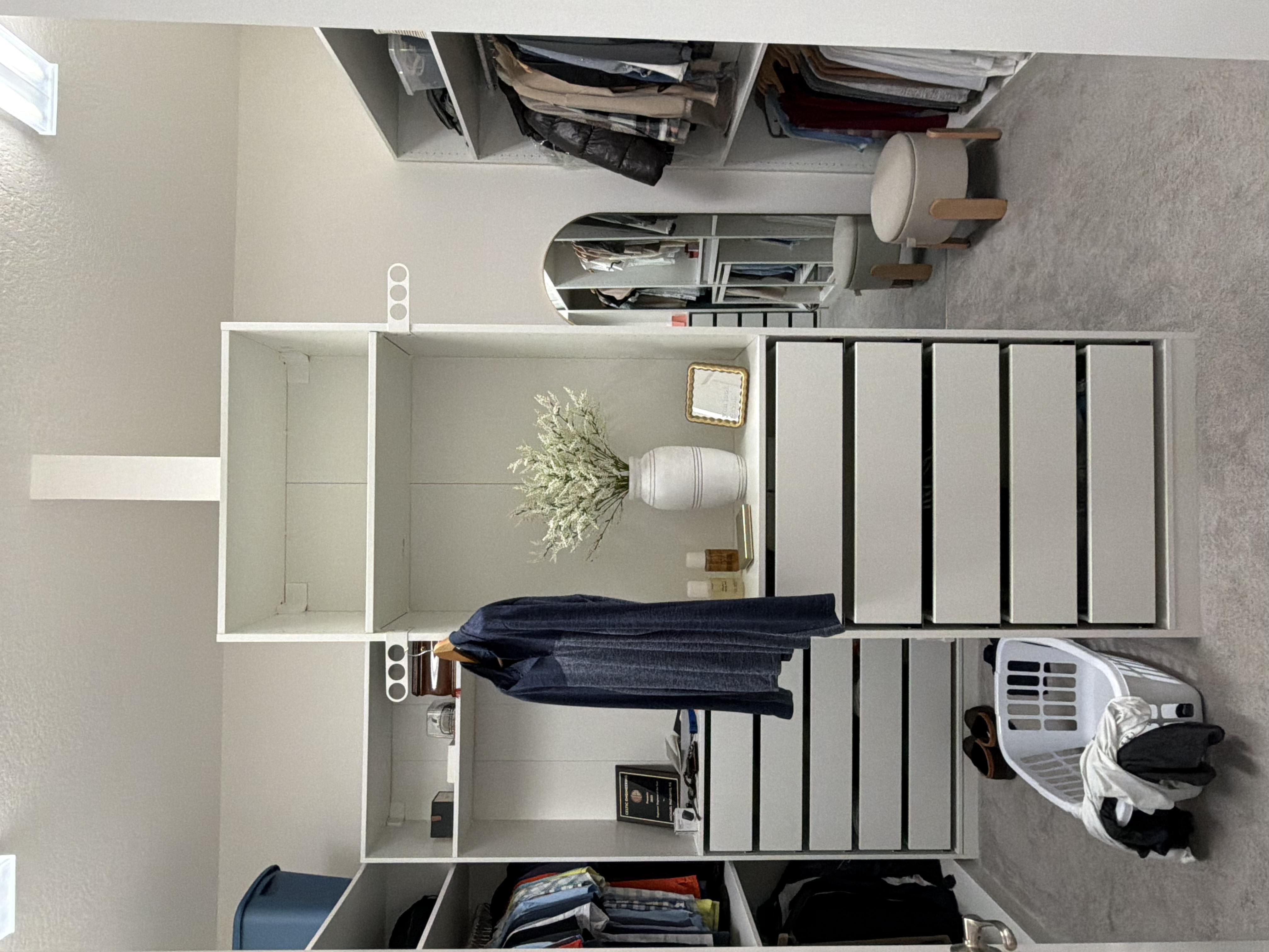organize the clothes on this closet room clean the floor and add soft led lights to every shelf