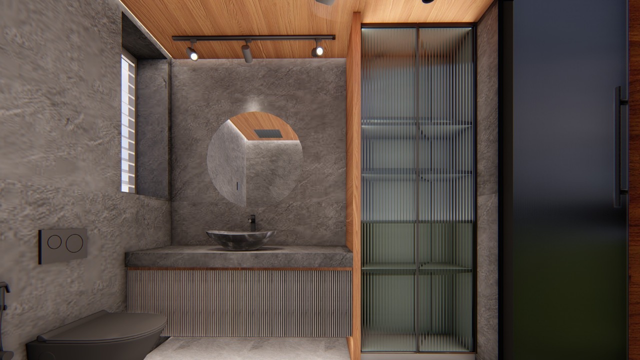 show illumination around the mirror like a halo in scattering yellow light show lighting inside the cabinet with fluted glass doors with profile handle ceiling is white and cabinet side wall matt black all bathroom accessories are matt black maintain original stone structure on walls