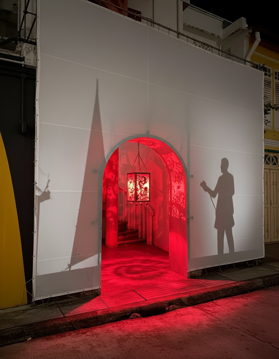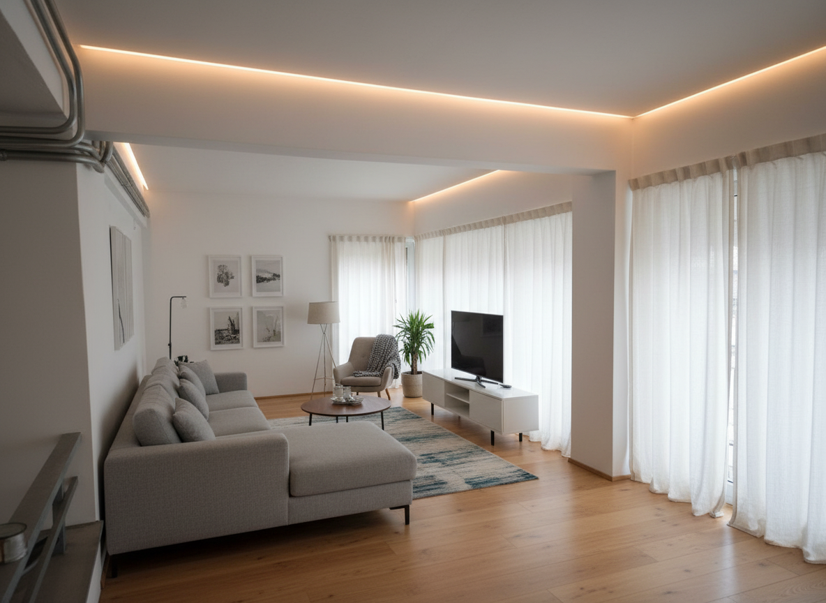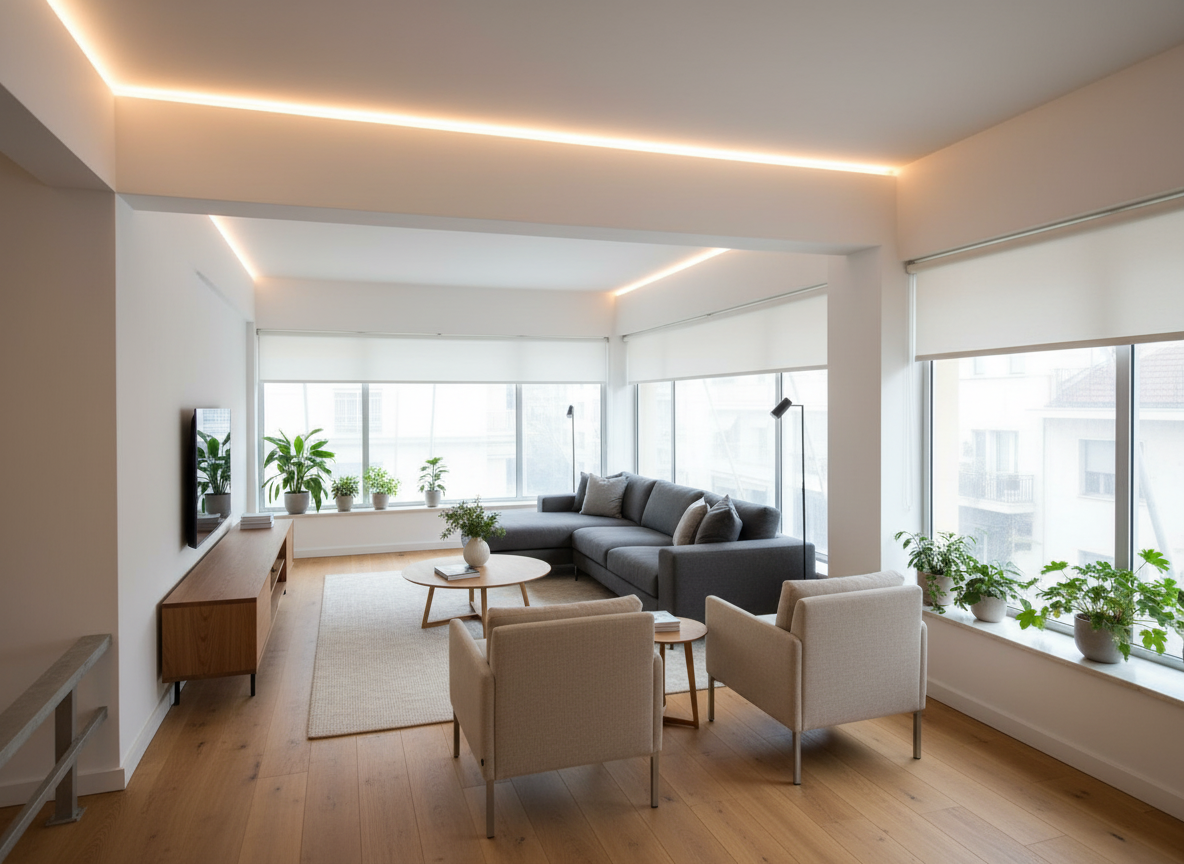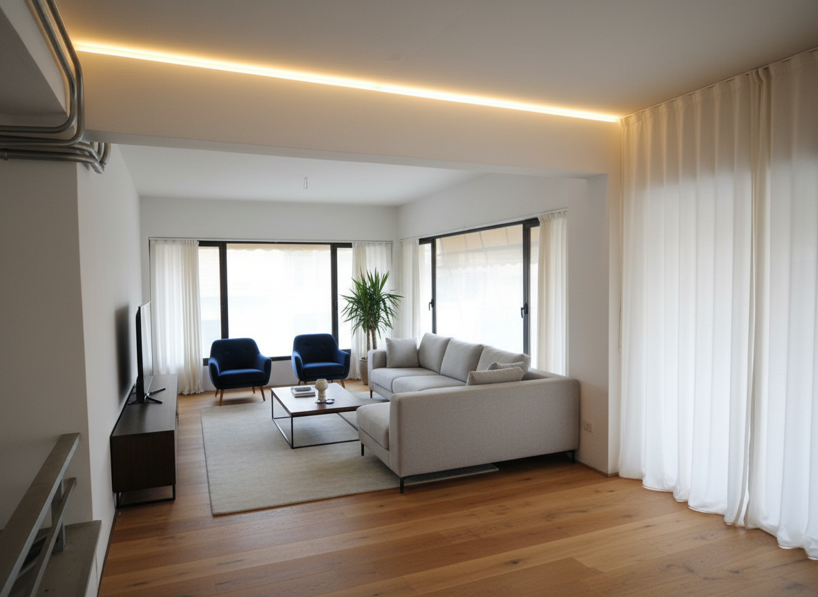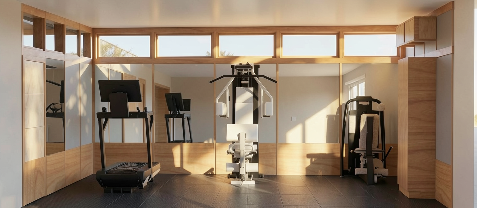 lighting stretch ceiling with no gypsumboard rubber matt flooring tiles mirror wall cladding with beechwood frames and plywood dado upper parta are fixed clear glass windows the other wall is just same mirror cladding but with roll up screen coming from ceiling