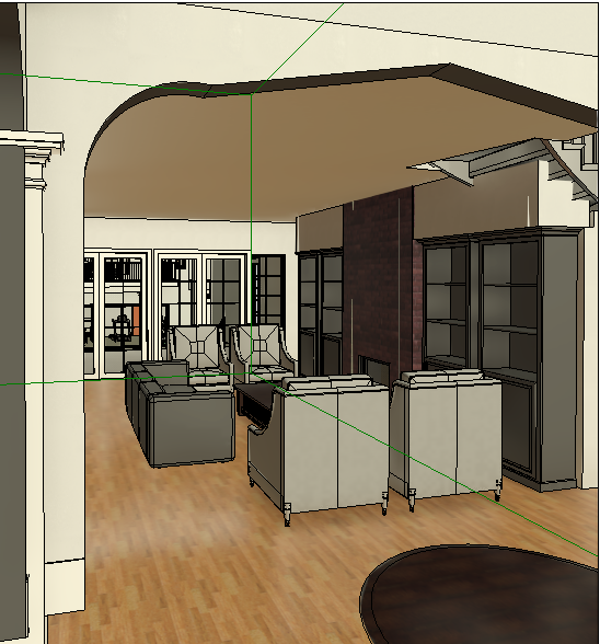 realistic image dusk sky outside turn on interior lights luxurious painted white panels on all walls add 1 rug under furniture add drinks on tables add books on shelves add white painted wood mantel and fire on brick wall in background correct the brick wall in the background and add a painted wood mantel with painting above it correct the bar area next to the fireplace make window and door frames white only smooth the arch