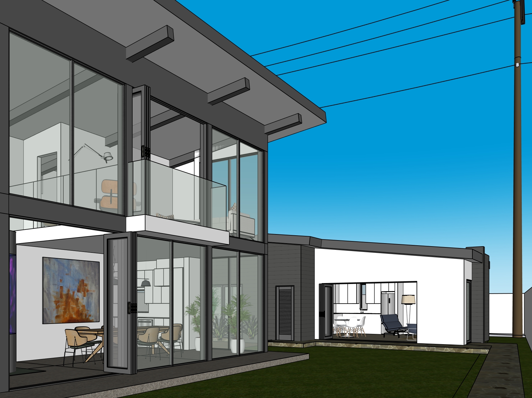 the site is located at 536 tahquitz 90272 evening view lights on inside the house add california wild grasses and flowers to the landscape add grass in the the yard the spaces enhance the glazing materials add some lights in the planting areas add lights inside the house and on the artwork keep the materials from the source image add people sitting at the dining room table having dinner add a woman sitting on the sofa inside the adu add trees on the adjacent properties like those seen in the pacific palisades