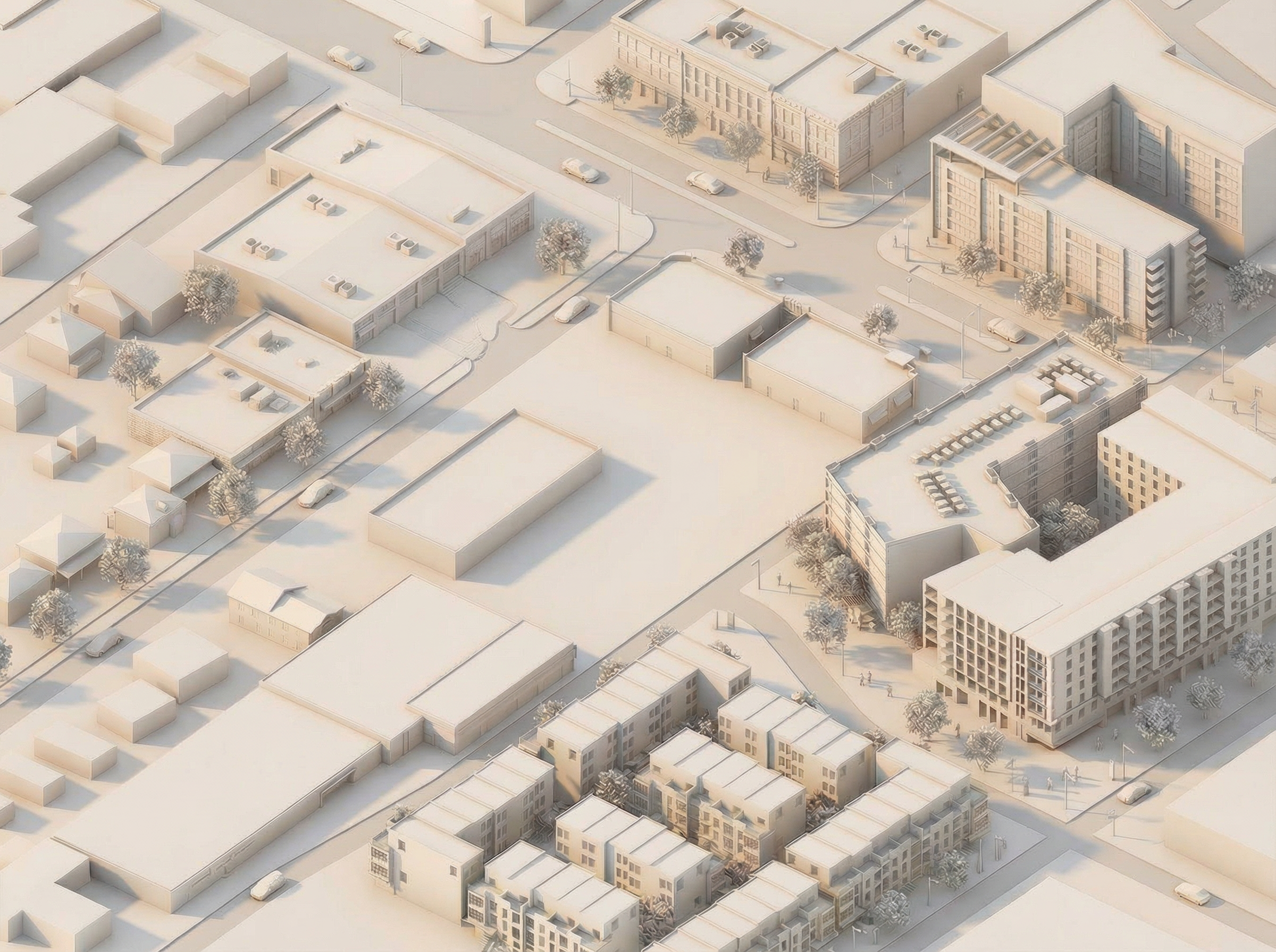 do not change any building geometry sidewalks vegetation or lighting reduce the size of all cars so they match true architectural scale cars should appear much smaller about half to two thirds of their current size keep cars simple white low detail clay model forms do not widen or redraw roads and do not add new vehicles do not modify people or trees maintain the same soft lighting and clay model aesthetic