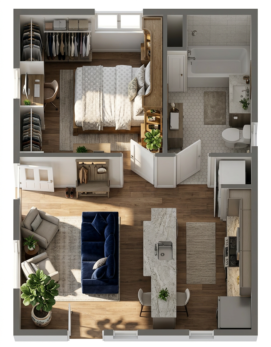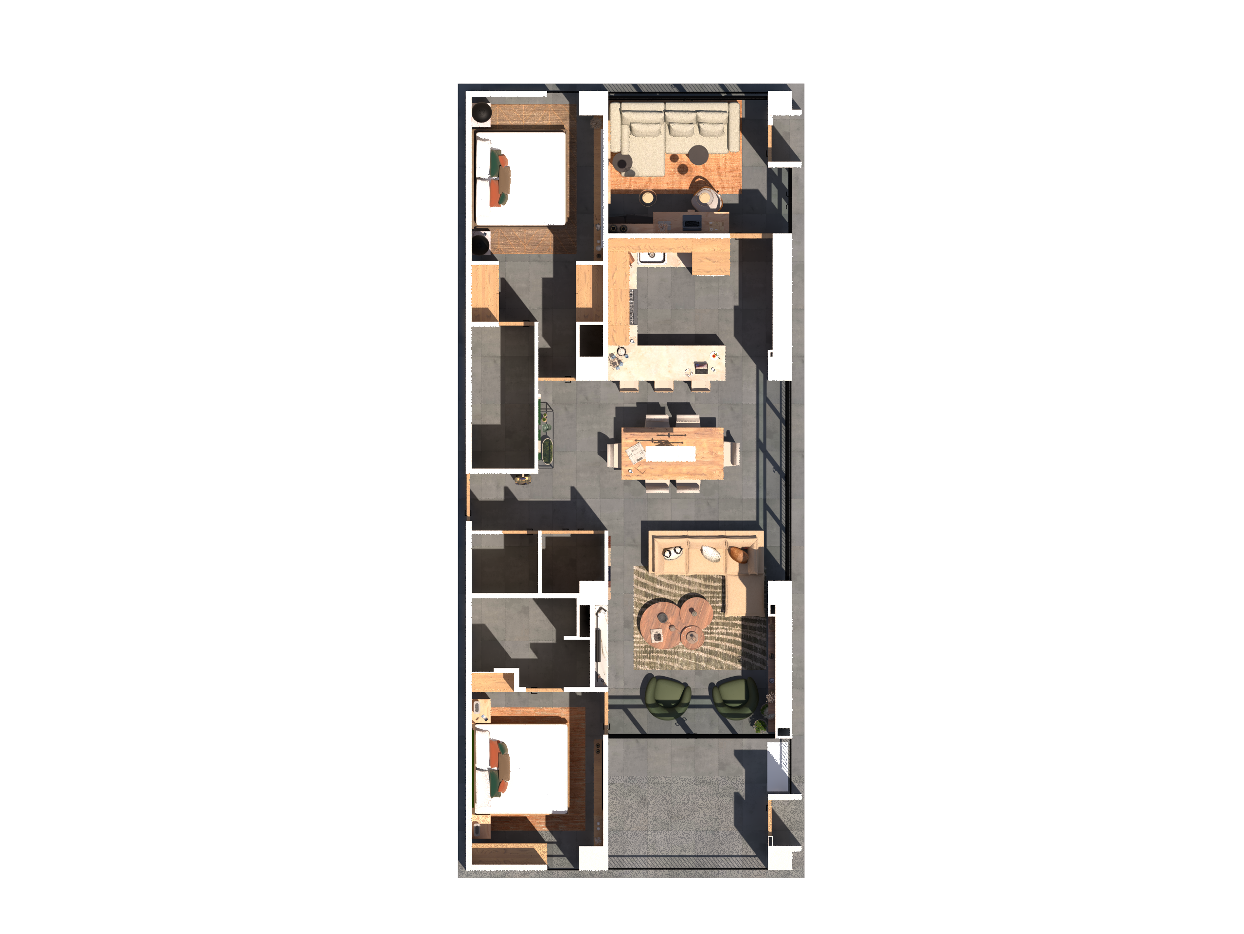 professional photorealistic architectural floor plan rendering in v ray 5 for sketchup preserve all existing furniture geometry wooden textures decorative elements architectural details and color palette orange wooden furniture gray upholstery warm tones critical visual enhancements flooring system modification replace pure black flooring with realistic medium gray polished concrete or light gray porcelain tile throughout rgb 145 155 165 apply displacement mapping for micro surface detail and tactile authenticity add subtle light reflection variation using roughness maps 0 3 0 4 specularity incorporate subtle weathering and natural wear patterns for lived in realism advanced lighting architecture v ray hdri dome light with professional daylight simulation 6500k neutral white v ray sun positioned at realistic angles for window side natural illumination ies photometric profiles on all pendant fixtures with warm 2700 3000k color temp global illumination gi enabled bidirectional with minimum 3 bounces bounce light simulation for soft natural shadow fill across all spaces secondary lighting warm accent lights in living bedroom areas cool functional lighting in utility zones realistic light attenuation and falloff distance calculations material photorealism upgrade wood furniture apply physically based material properties with accurate roughness maps normal maps and subtle ambient occlusion ceramic elements realistic gloss finish with proper specular highlights fabric upholstery subsurface scattering simulation for natural light transmission concrete flooring micro displacement with weathering minor scratches dust particles metal fixtures accurate metallic brdf bidirectional reflectance distribution function glass elements realistic refraction and reflection with proper ior values exposure color grading linear color workflow with professional tone mapping reinhard or linear exposure neutral to warm white balance 5000 5500k for balanced visualization natural color saturation enhancement without oversaturation professional gamma correction 2 2 for accurate screen representation post production refinement ambient occlusion in all corners edges and fixture bases subtle realistic realistic depth of field for photographic camera simulation subtle vignetting for compositional framing light bloom effect on bright surfaces optional conservative use professional noise reduction in shadowed areas while maintaining texture detail color grading pass for warm inviting residential atmosphere render quality specifications render engine v ray cpu or gpu depending on hardware antialiasing adaptive 2 8 samples minimum image sampler adaptive max ray depth 5 7 for balanced quality speed secondary gi engine brute force or light cache denoiser v ray s built in denoiser for clean final output