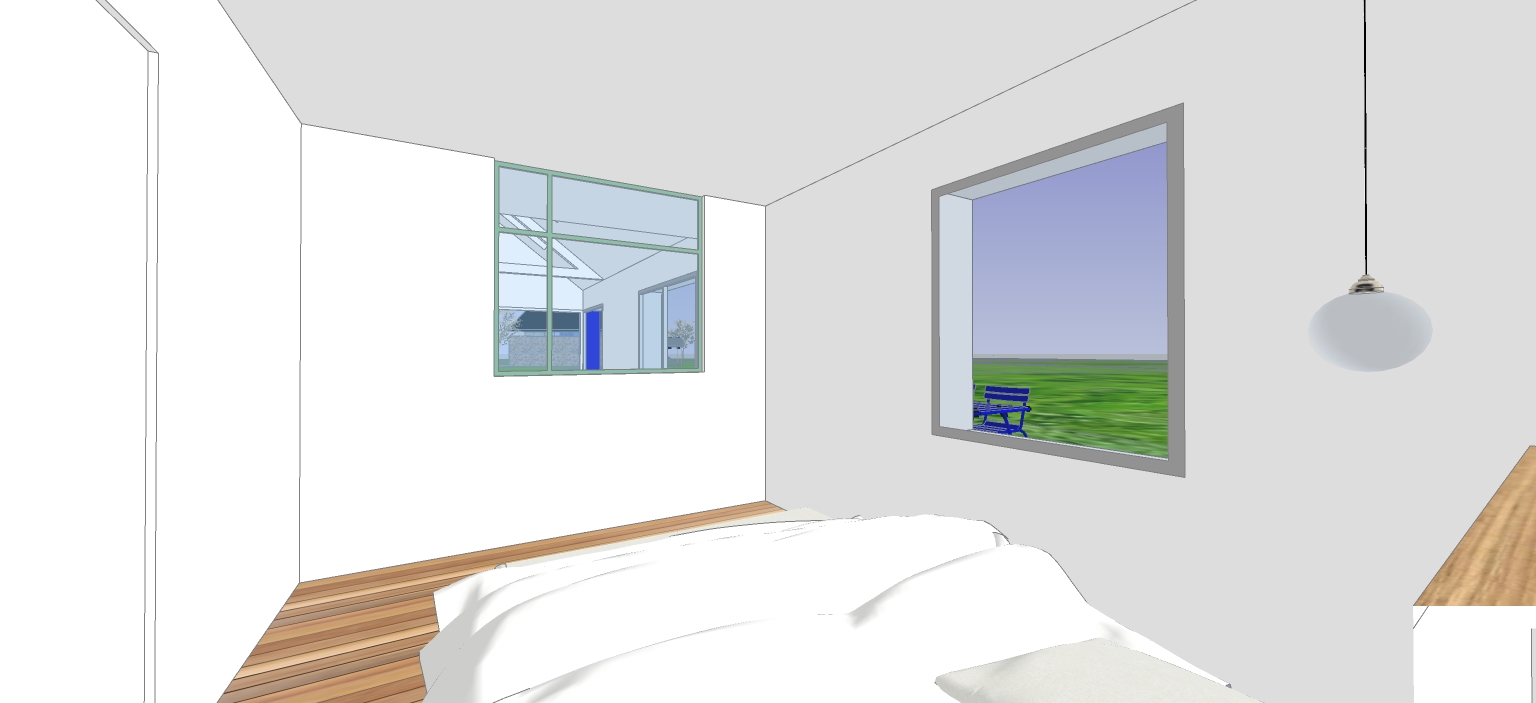 minimalist bedroom slanted white ceiling soft white walls seafoam green accent wall large window warm natural light with a nice blue sky and lush vegetation wooden floor with light oak tones rustic texture simple wooden bed white comfortable bedding and pillows tranquil and serene atmosphere cozy morning light gentle shadows casting from the window relaxing ambiance