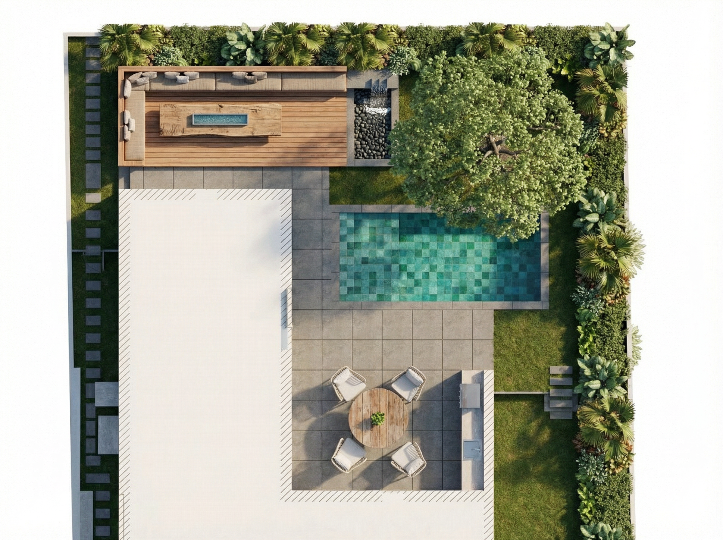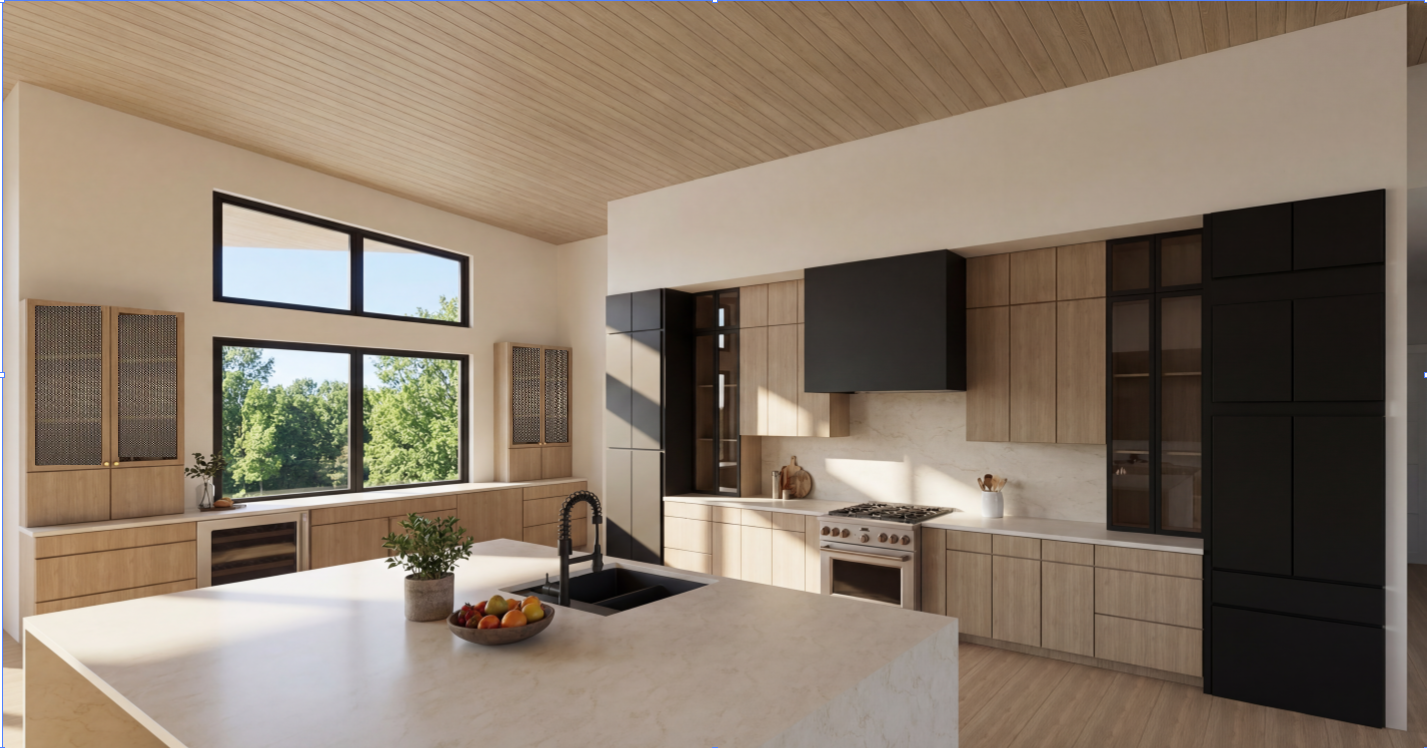 realistic architectural interior rendering in natural daylight preserve all existing architectural elements exactly as shown do not add remove or reposition any structural components cabinetry layout appliances or fixtures unless explicitly stated below countertops two countertop sections only one to the left of the oven and one on the island no other surfaces added material cream marble with very fine thin naturally blending veins soft and organic not bold or graphic no thick or marker like veining cabinetry all light wood cabinetry and flooring shown should render as light neutral oak neutral not warm natural grain not yellow or orange all exterior facing black cabinets must render in matte black no sheen or gloss left window cabinets mesh door detail the tall flanking cabinets on either side of the windows on the left wall must have door fronts featuring a woven metal mesh inset panel a fine tight diamond pattern wire mesh with a dark bronze aged brass tone set within a flat oak frame the mesh has visible depth and texture it is not a printed pattern or perforated sheet but a three dimensional interlocked woven wire hardware small round brass knobs the cabinet body frame color and proportions must remain exactly as shown in the base rendering only the door insert material changes to this mesh detail styling details interior of left side cabinets add stacked plates and minimal decorative objects visible through the mesh island surface one small potted plant and one fruit bowl placed naturally no pendant lighting added atmosphere realistic natural daylight windows must show lush green trees and a clear blue sky no artificial lighting introduced do not add any furniture fixtures d cor or architectural elements beyond what is described above do not add fixtures to the cabinets make sure there is a thick metal mesh on the far left wood cabinets by the windows as described three dimensional interlocked woven wire not a printed pattern or perforated sheet the black cabinets ones should be glass like the picture attached leave the appliances how it is in the picture attached do not change anything i did not ask