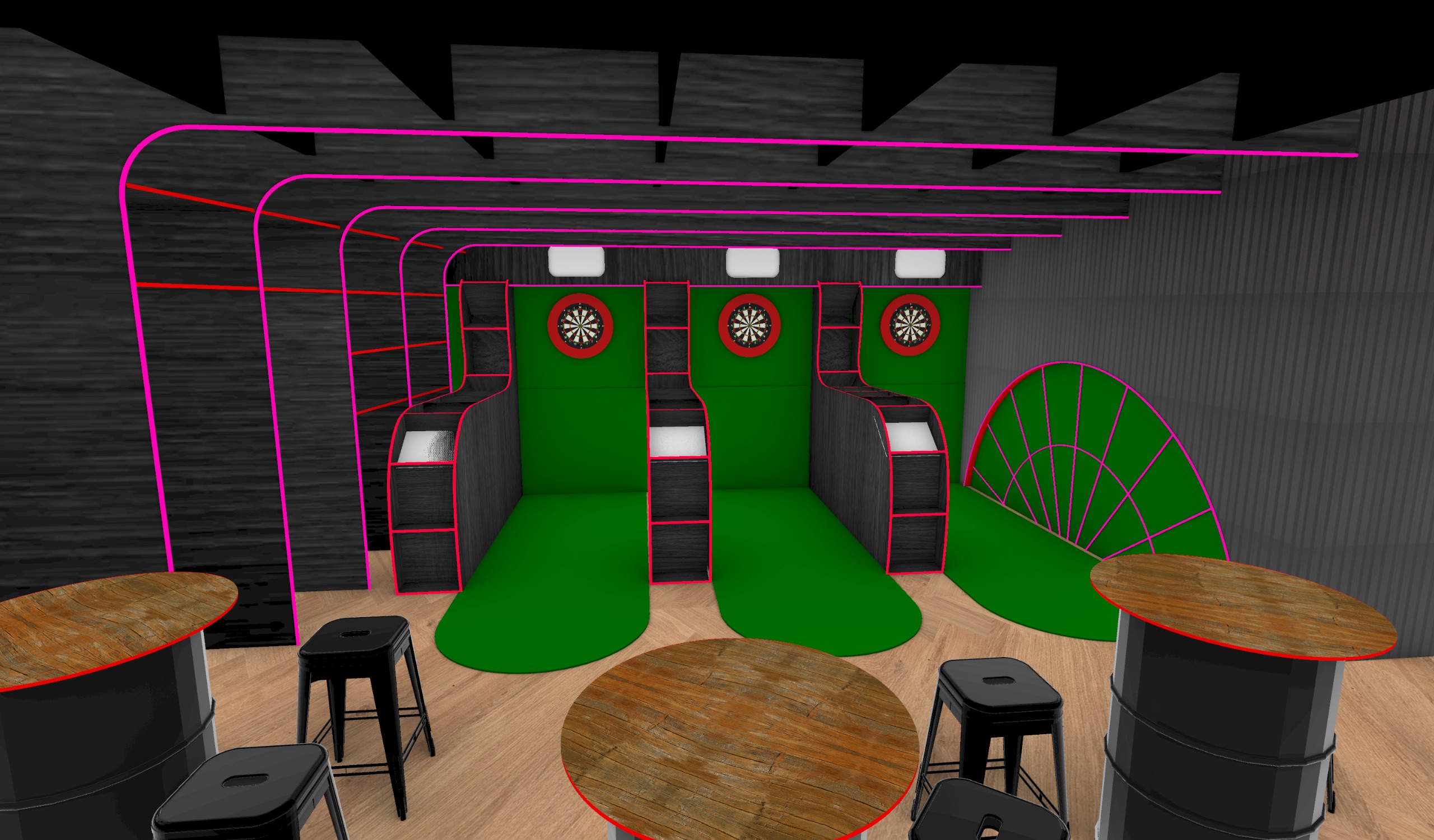 the six white squares need to be tv screen score boards the pink lines on the left and ceiling are magente red led lights the curves and lines on the right side wall are also red magenta led lights accentuate the dart boards with light from the top and sides on the shelfs on the left there need to be hanging plants no pots like a plant wall ceiling are black wooden beams and the right side wall are small black wooden slabs overall atmosphere is cozy warm dart event