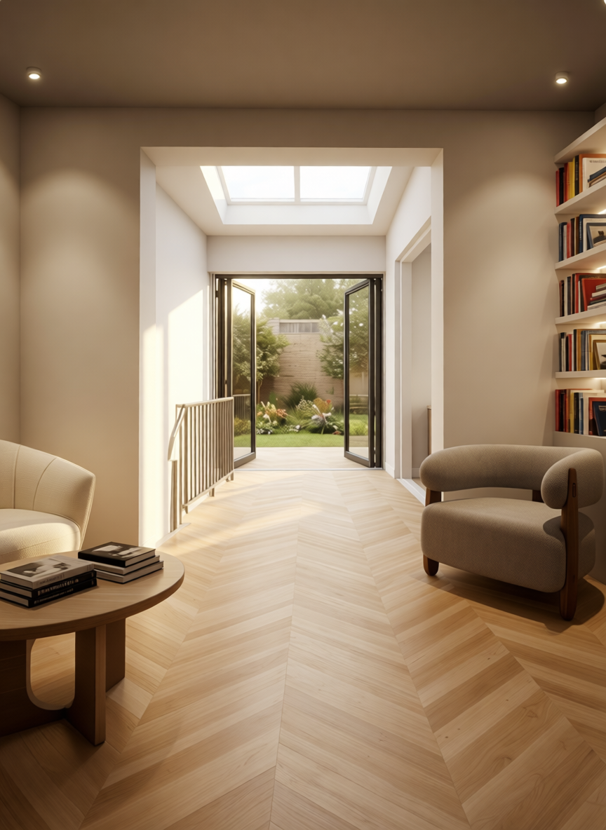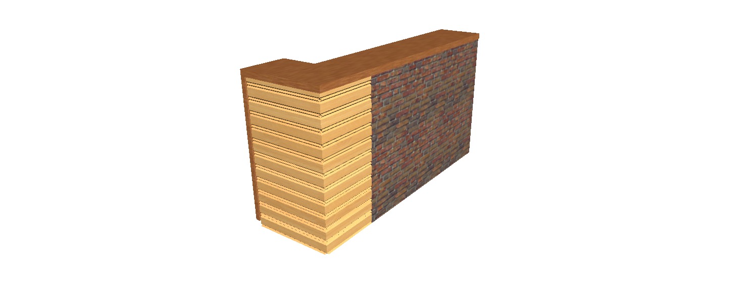 render a modern rustic reception counter with a wooden top in rich mahogany brown the vertical panels are alternating light oak and dark walnut adding contrast and texture the side features an exposed brick design in warm red and deep charcoal the atmosphere is cozy and inviting with soft ambient lighting casting gentle shadows across the wood and bricks enhancing the natural textures and earthy tones