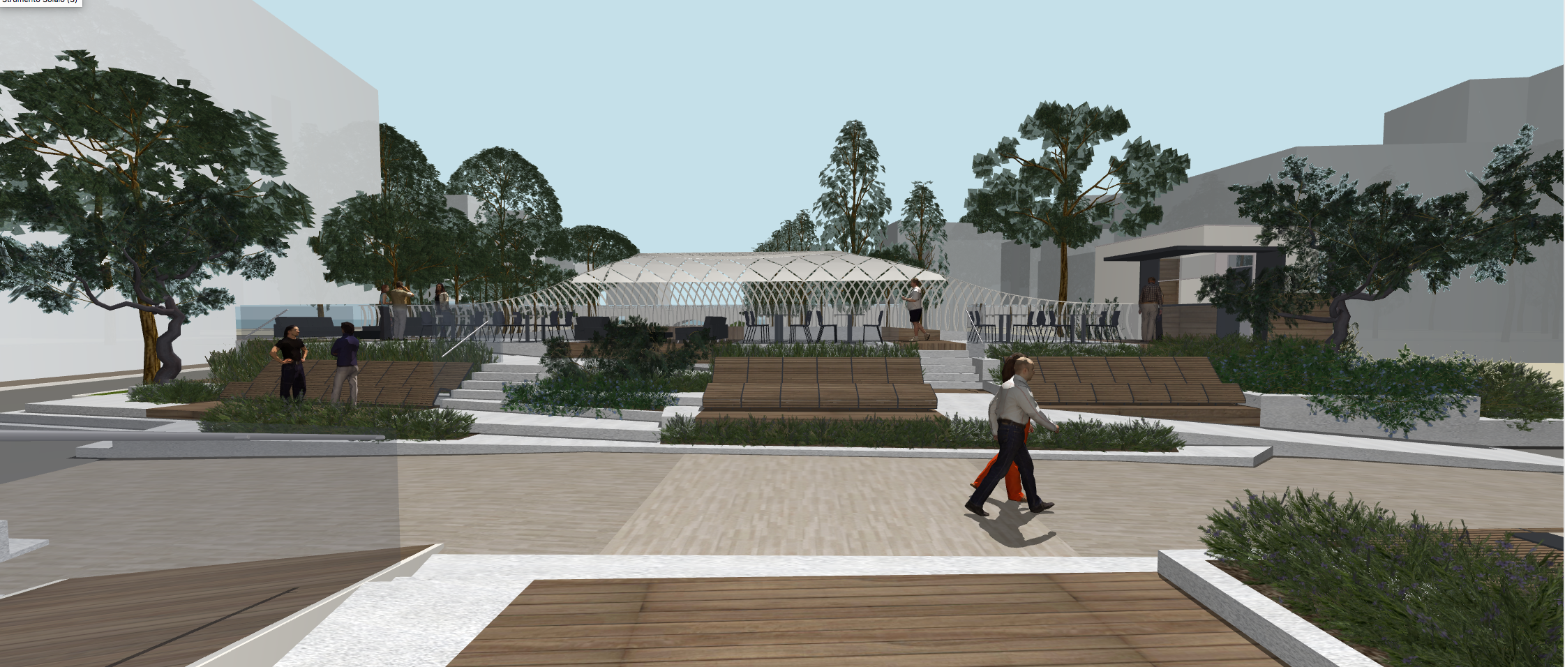 a new urban furnishing on a bridge newly laid teak flooring a sunny day with many people walking and talking to each other