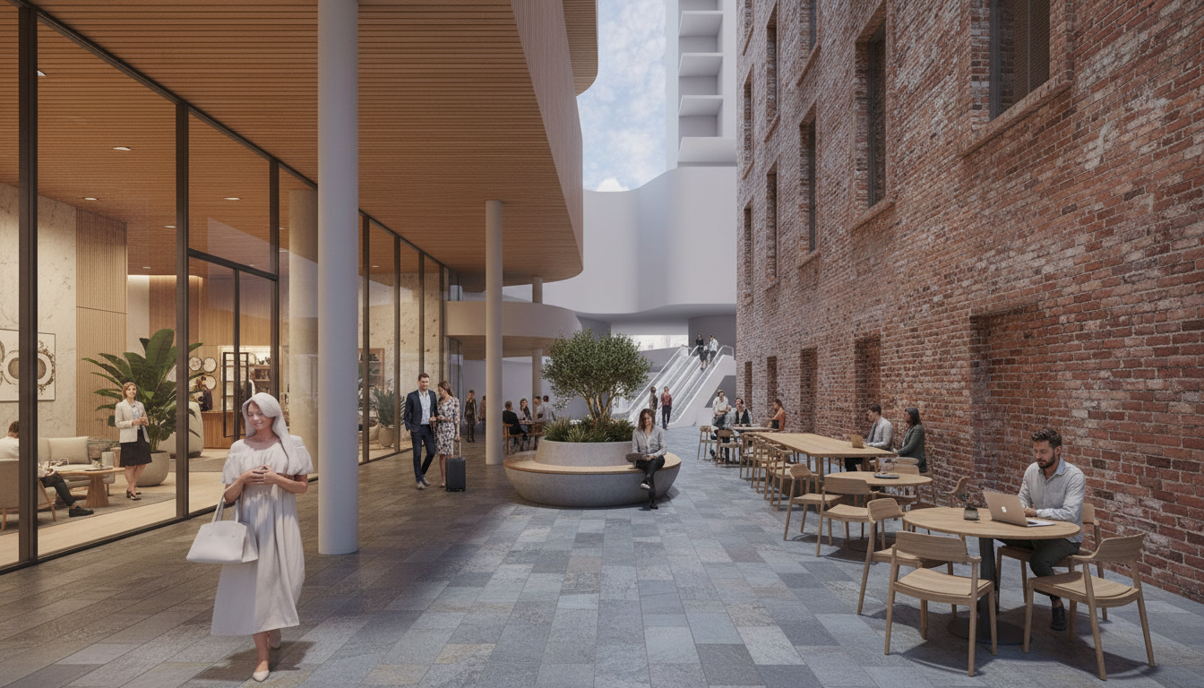 change the exposed brick wall on the right to an exposed sandstone wall but make it old and weathered remove the loose furniture in the plaza and replace it with fixed planters with integrated bench seating