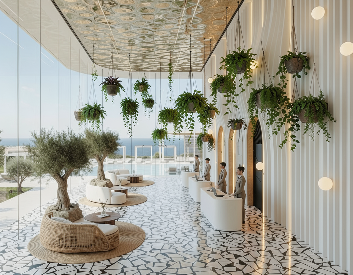 removes this ceiling for new ceiling and turns 90 degrees continuing the design of plastic moving stripes of the large wall behind the reception with the same logic and from inside from some slits with free composition to hang dominating impressive green plants elegantly as if you were locked in composition with other hanging plants