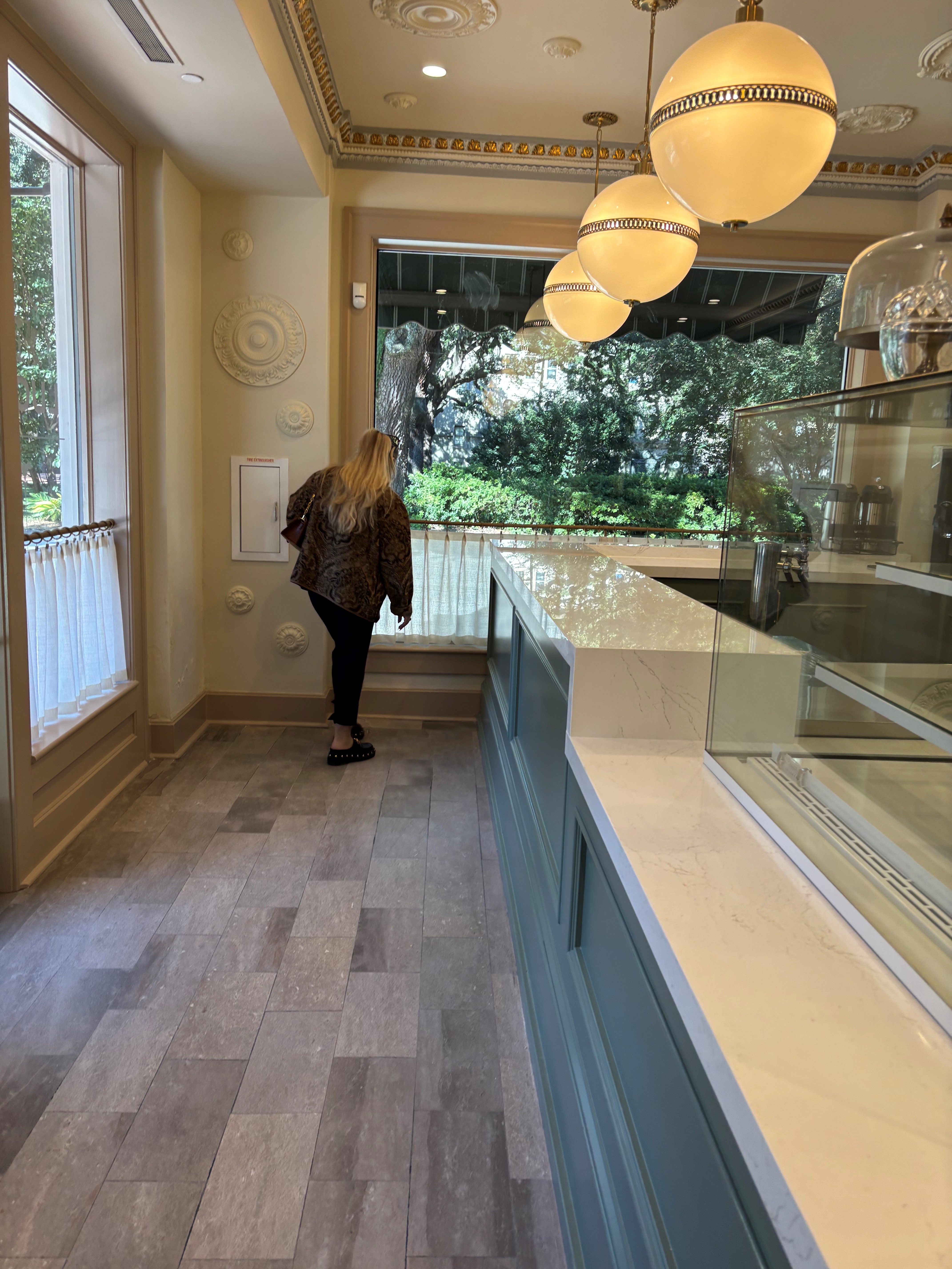 interior render natural rlightof a renovated lucas cafe architecturl details original frieze and medalions on walls and ceiling contemporary with retro details like globe lights and brass fittings cafe style half sheer curtains