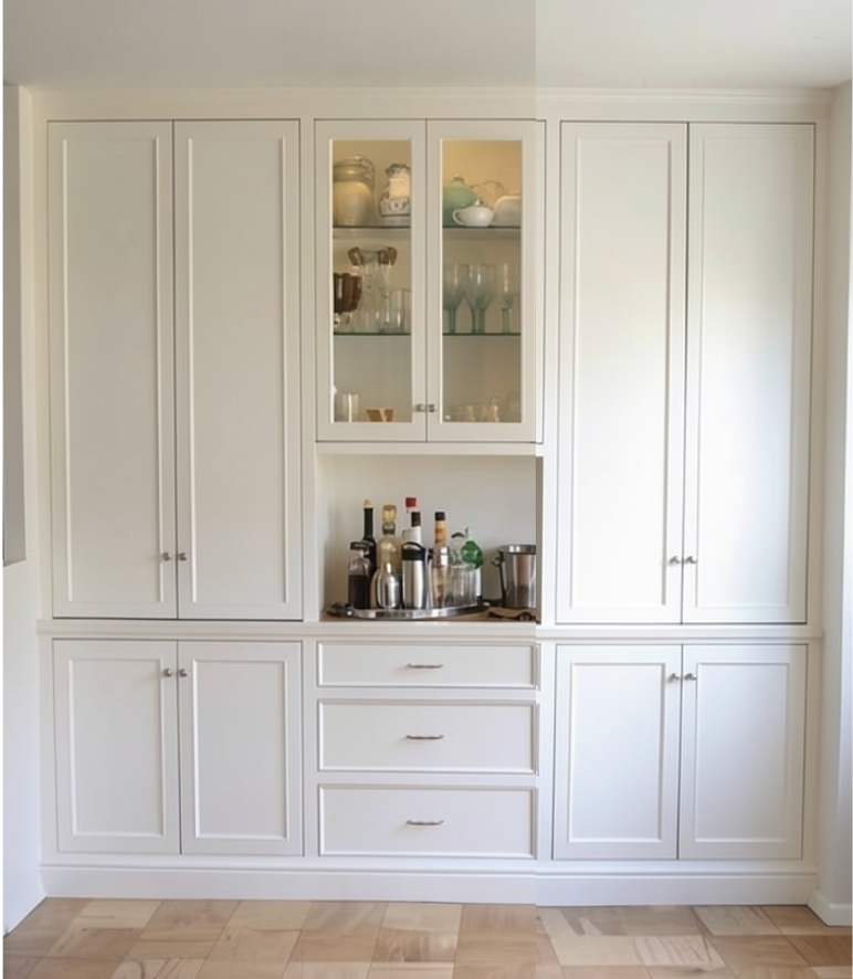 swap the decor on the shelves for books and art remove the liquor on the countertop change all of the cabinet front doors to flat panel overlay they are currently inset instead show the door covering the entire face of the cabinet
