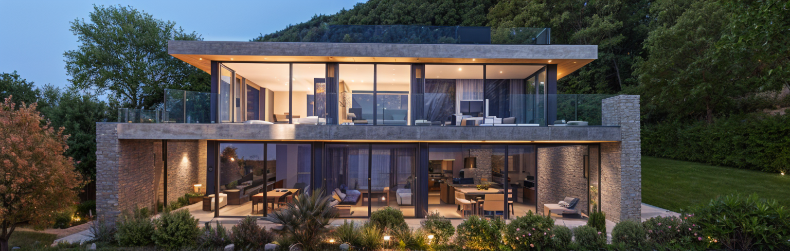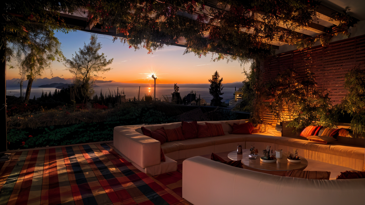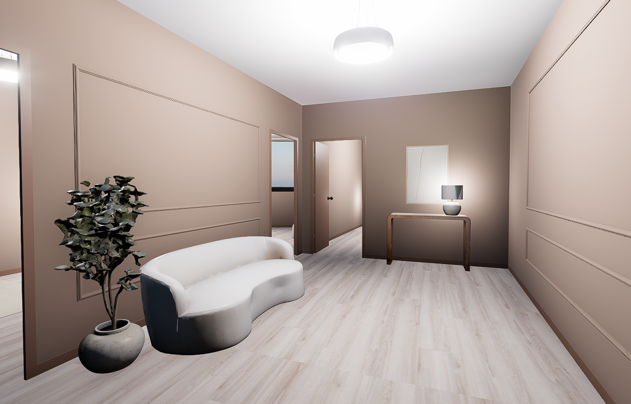 exterior shot generates a visual enhancement of a warm minimalist foyer the walls are beige with a specific warm tone hsv 23 27 64 decorated with rectangular moldings of the same color integrated to create a subtle and elegant texture the floor is light wood with soft grain and matte finish on the left a curved white cream sofa with contemporary design sits next to a decorative plant with dark green leaves in a gray ceramic planter with a rustic finish on the right a light wood side table with rounded edges holds a lamp with a gray base and white shade while a minimalist rectangular mirror is hung on the wall above it two open doors painted in beige connect to other areas main comes from a white circular ceiling lamp with soft even light complemented by the warm light from the lamp over the table enhance the details textures of materials wall wood textiles and ceramics and colors but without altering the layout or adding new elements keep the style warm natural and realistic architecture