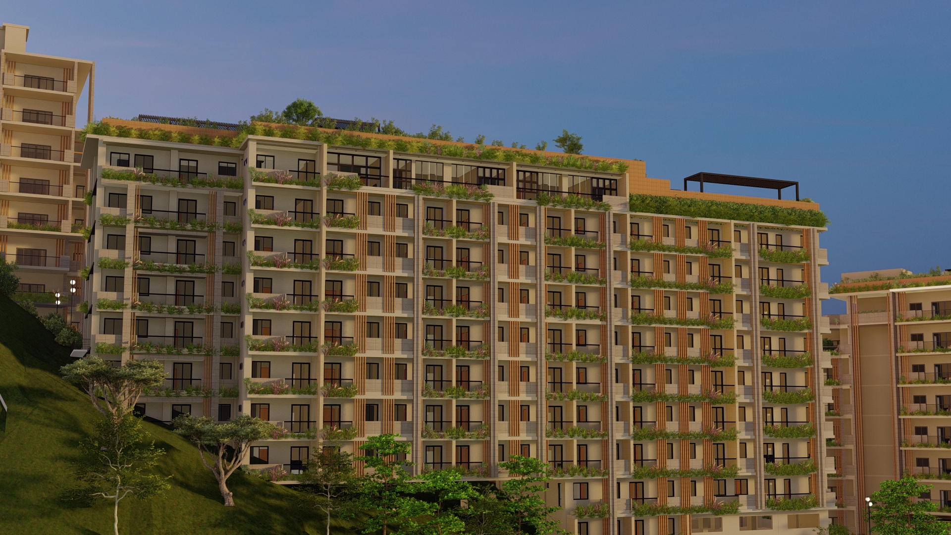 sunset lighting modern contemporary materials in warm gray tones improve plants with more variation of pines and forest trees wood slats in the facade cinematic photorealistic 4k resolution 16mm camera lens
