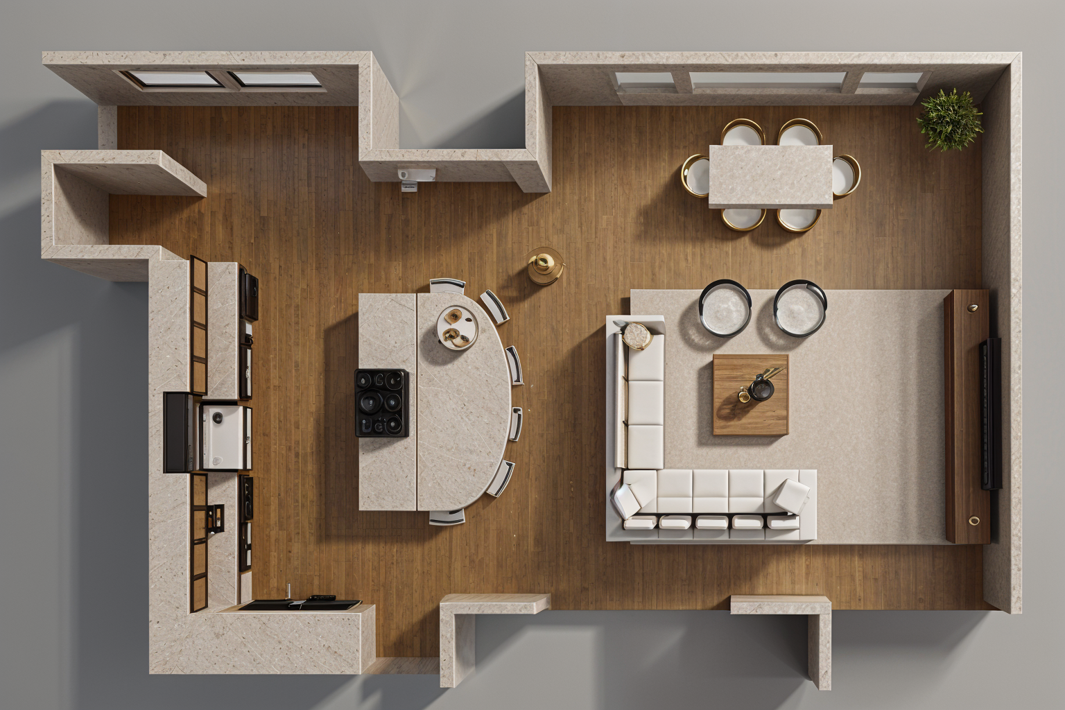 do not change any of the furniture or furniture colors add a modern deep blue and white patterned rug under each seating grouping add deep blue and white pillows on every chair and sofa add deep blue vases on the tables
